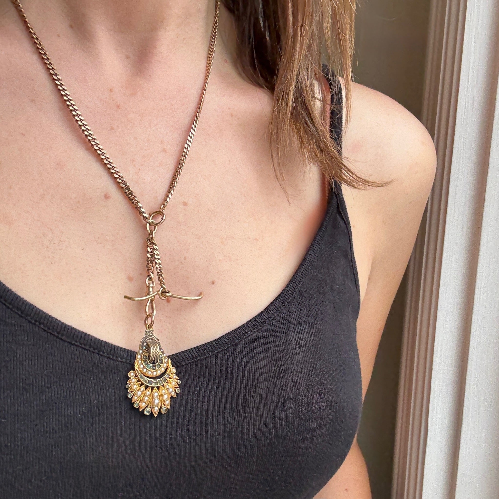 Two gauges of antique flattened curb links are paired in this must-have 14k gold married chain. The curb chains are joined by a sassy gold bar link. They fasten in the front with a spring ring; a watch hook and curvy t-bar drop are ready to hold all the bits & bobs you can throw at it. With the perfect length and a slinky, supple feel, this is soon to be your favorite necklace. The ingredients date to circa 1890-1920.