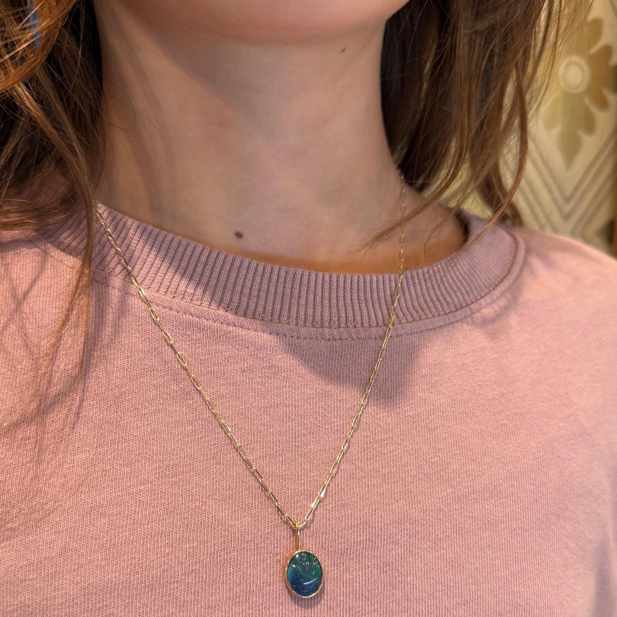 This brilliant black opal pendant is out of this world. The oval stone is unbelievable fiery, with wild greens, blues, and flashes of red and purple. It's displayed in a sleek, closed-back 14k gold bezel; the enclosed back helps protect the fragile opal from the elements. An integrated bale makes it easy to add this gorgeous pendant to all your favorite chains. Circa 1970.