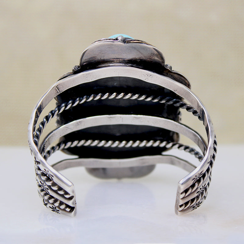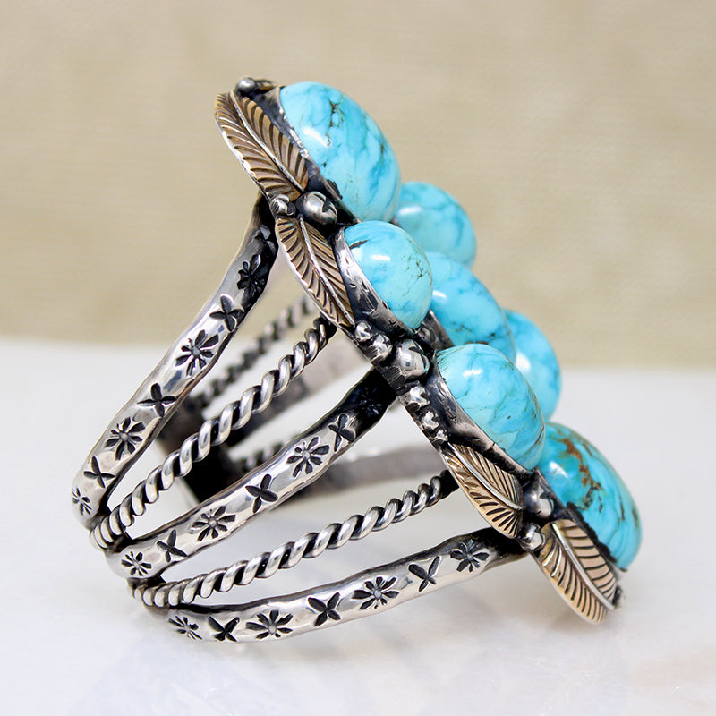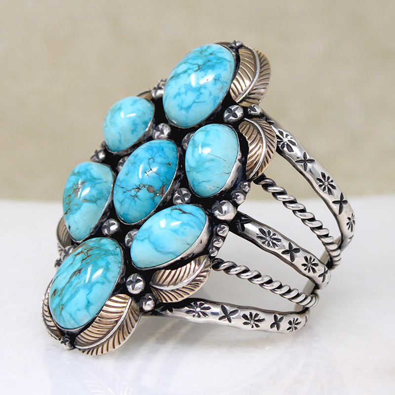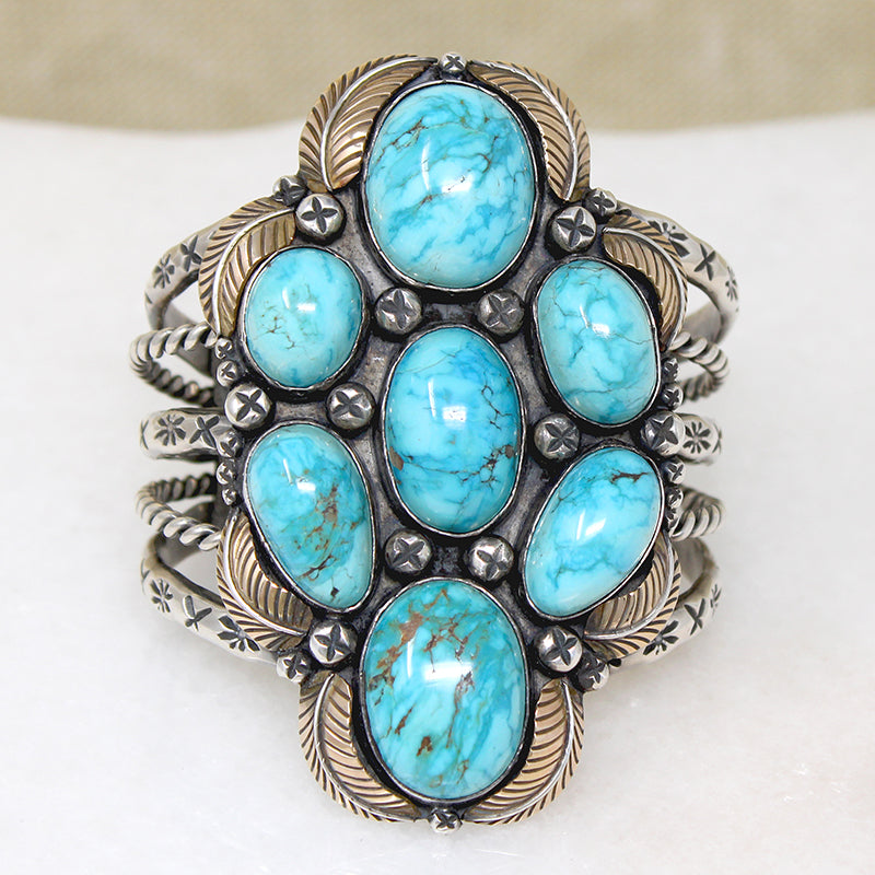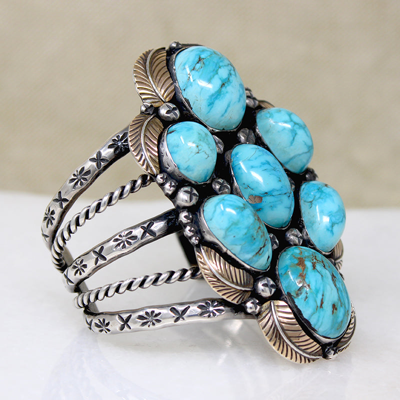 One of the most outstanding Native American cuff bracelets we have ever seen. Seven big, deep cabochons of bright blue turquoise are set in a vertical cluster. Delicately modeled sterling silver leaves curl tenderly around the stones; the leaves are all gilded in 14k gold. Small embossed beads are scattered throughout. This incredible centerpiece bridges a five-bar cuff that is embellished with silver twists and rocker stamps. Amazingly, this work of art is unsigned. Circa 1970.