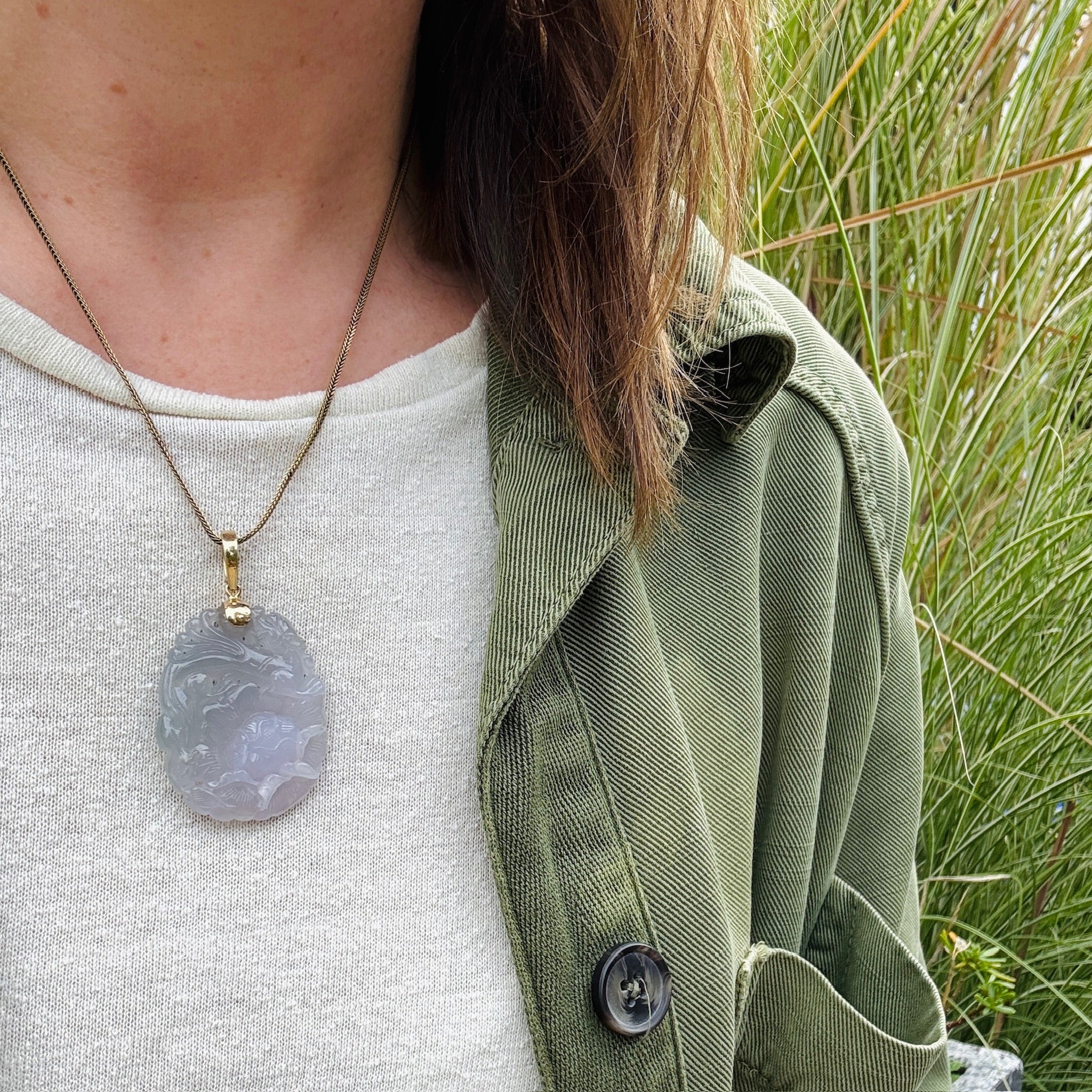 Jade of the most delicate lavender color is carved into, I believe, a peacock perched atop lush peony blossoms. In Chinese culture, the peacock symbolizes power, beauty, and rank, and good luck, while peonies are associated with wealth, honor, peace, beauty, and prosperity. A very auspicious pairing. The glossy jade carving is capped in 14k gold with a cleverly designed hinged bale, perfect for adding the pendant onto a strand of beads. Circa 1930.