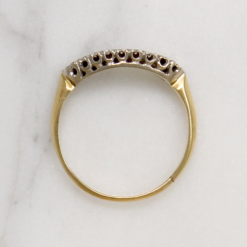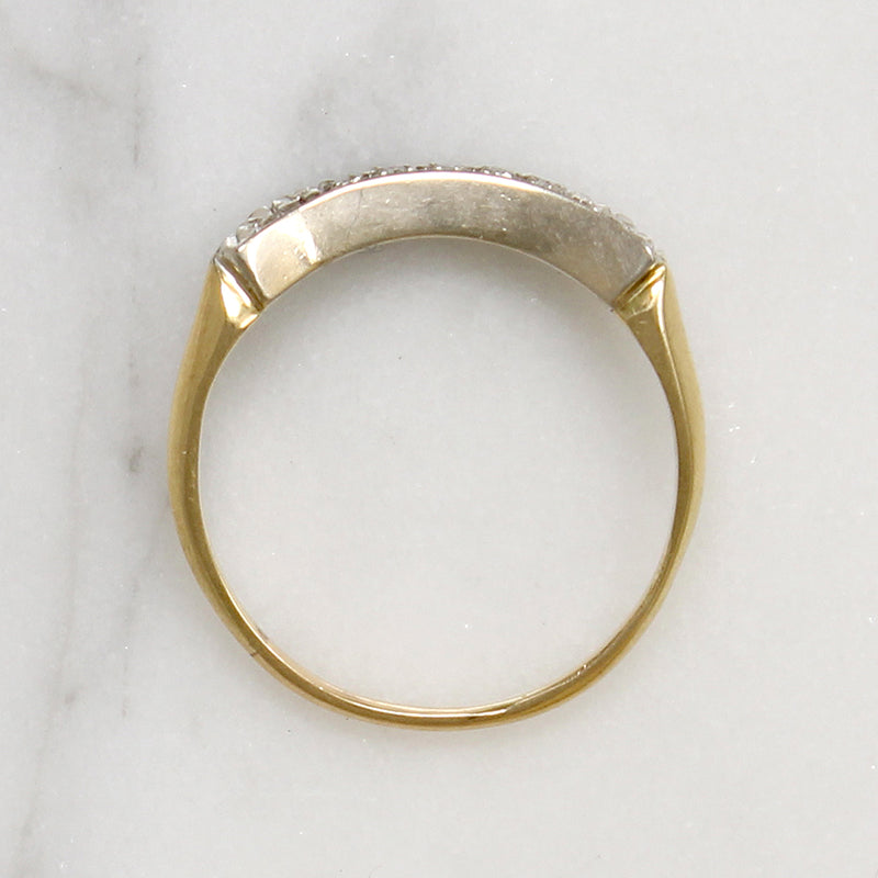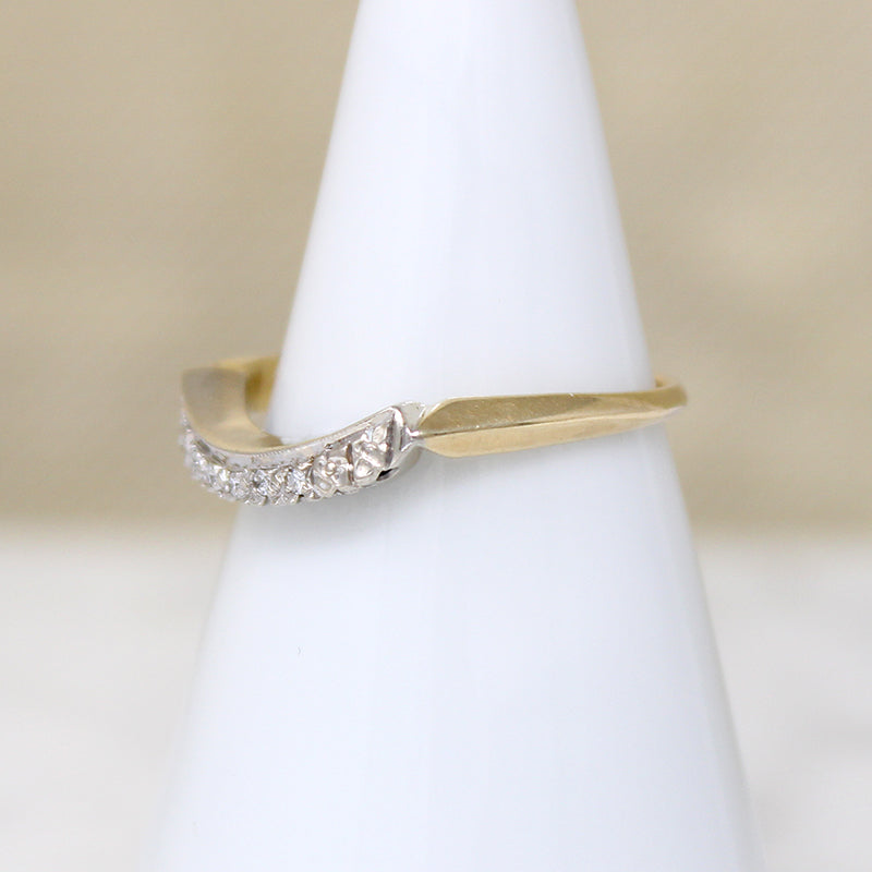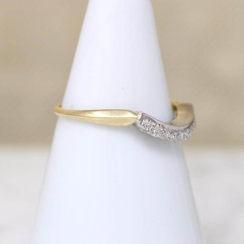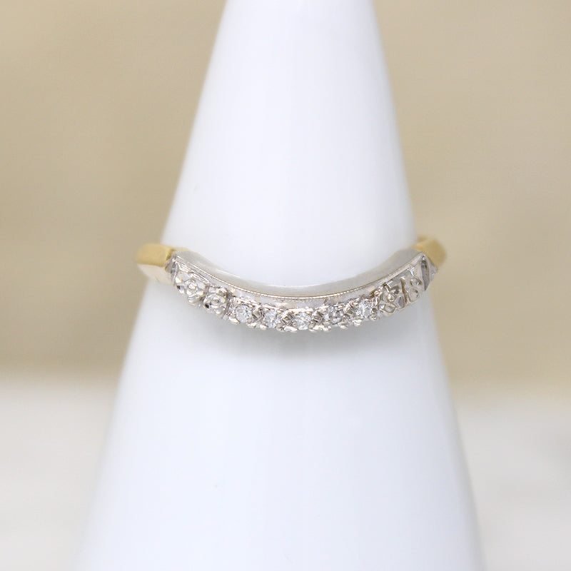 Here's something you don't see every day ... a true vintage curved diamond wedding band. This rare little gem has all of the romantic details we love in a Mid Century band: pretty diamonds set in white gold, engraved milgrain and flowers, lacy gallery, and a gracefully sculpted 14k yellow gold band. The diamonds and wee flowers curve across the top of the piece like a bright smile. Its inner curve is smooth, perfect for snuggling up to a vintage engagement ring. Pinched shoulders flare and then taper into a slender knife edge band. Circa 1940.