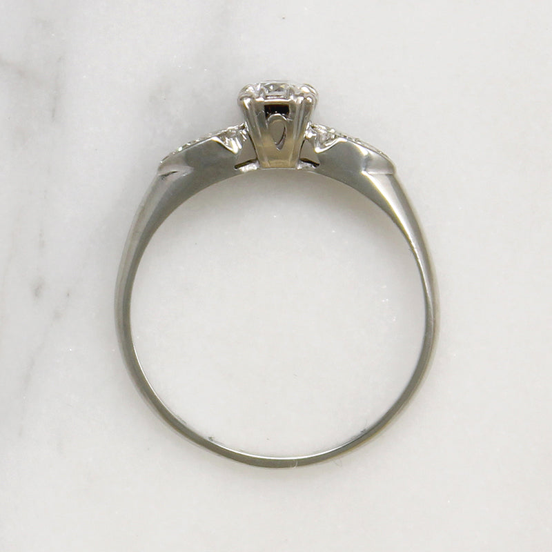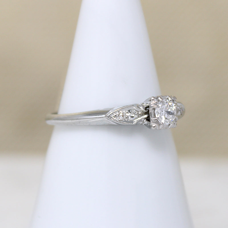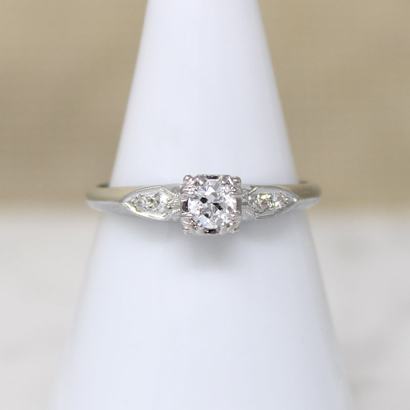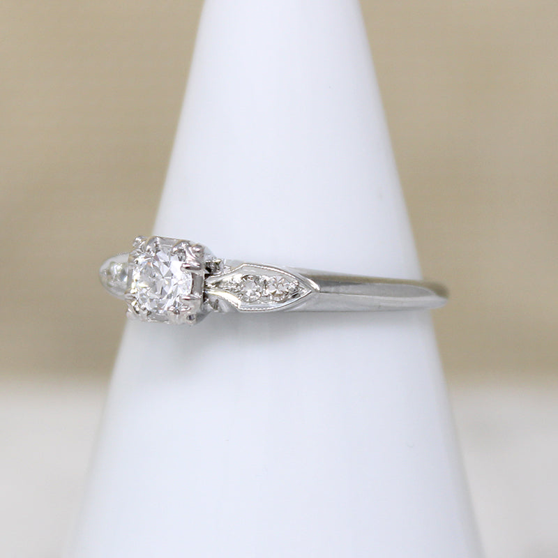 Refined details elevate this romantic diamond and 14k white gold engagement ring. The .20ct old European cut diamond shines bright in a raised head with beautifully expressed trefoil prong corners. Four glittering accent diamonds flank the head, set in engraved shield-shaped shoulders. A crisp knife edge band completes the elegant look. Circa 1940.