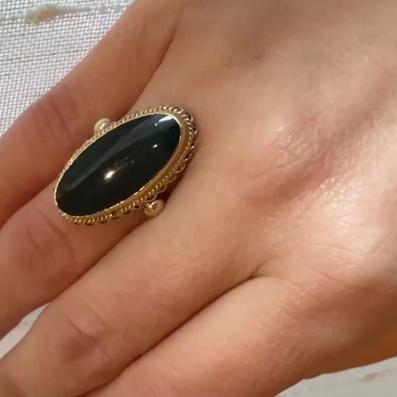 Subtle and seductive, this deepest green bloodstone displays blossoms of darkest red. The bloodstone is an elongated oval, bezel set in a handsome 14k gold ring. Delicate gold work frames the bezel. Split shoulders and a grooved band are punctuated by glowing gold orbs. This mesmerizing stone appears, at first glance, to be black; gaze into its depths and its intense colors will slowly reveal themselves. Circa 1940.