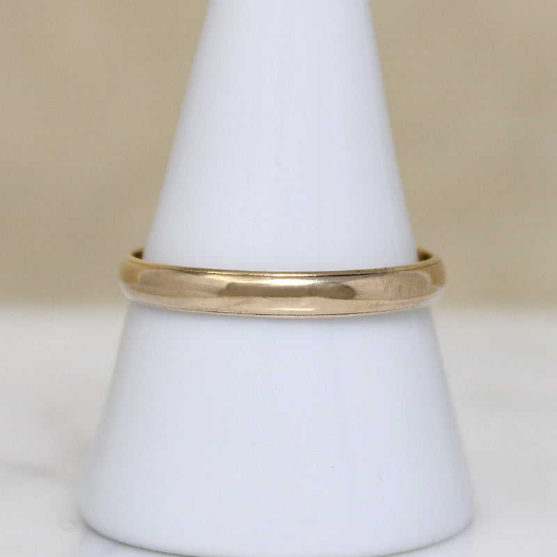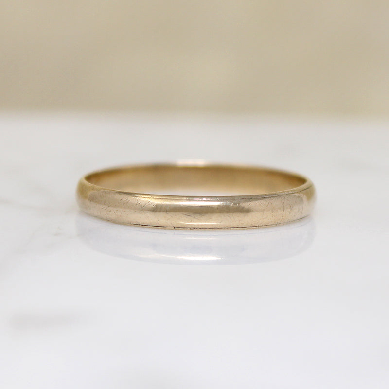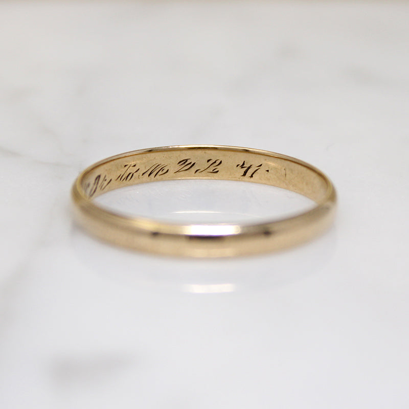 A slim 14k gold wedding band, half-round with a stepped edge. Engraved with the personal inscription, "NMR jr. to MDL '41." Always nice to find an attractive band like this in a large size. Circa 1940.