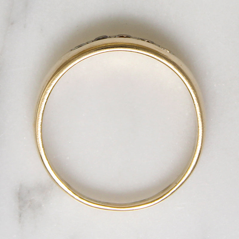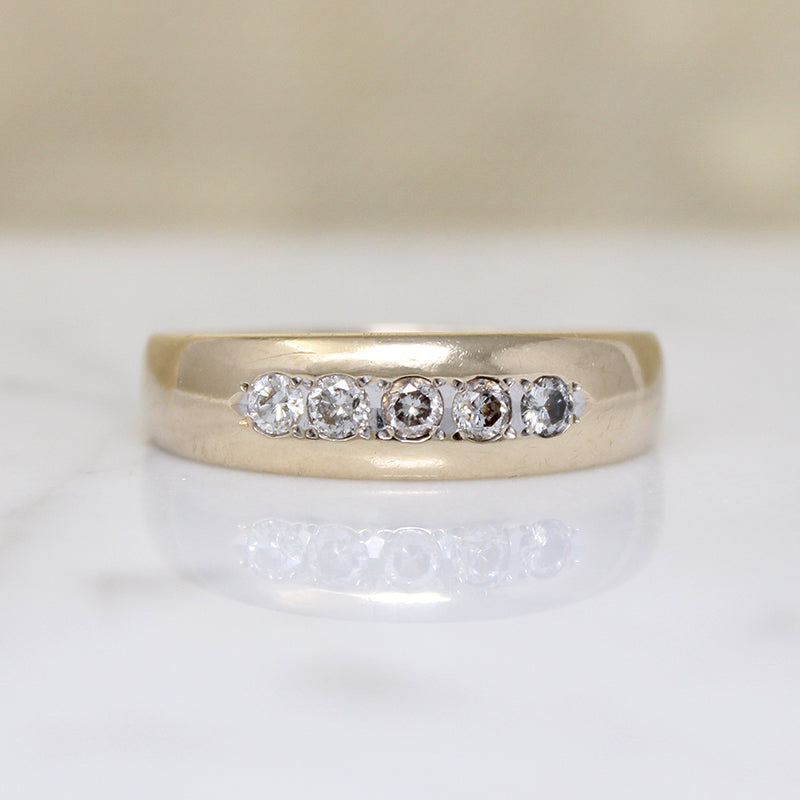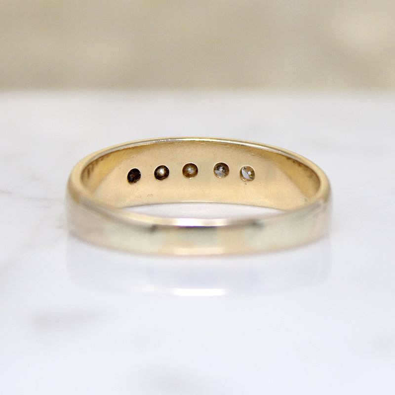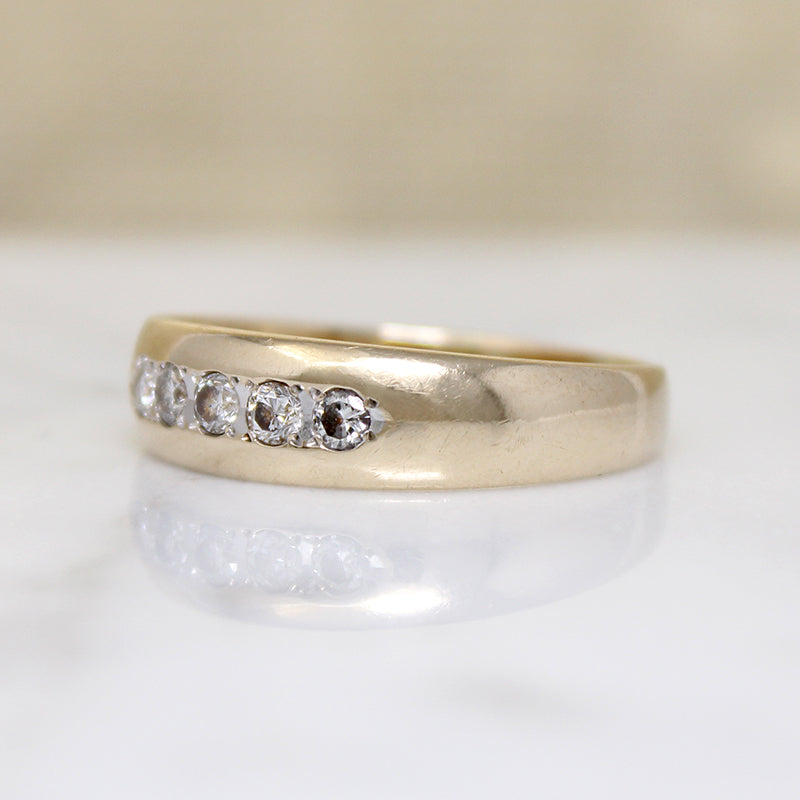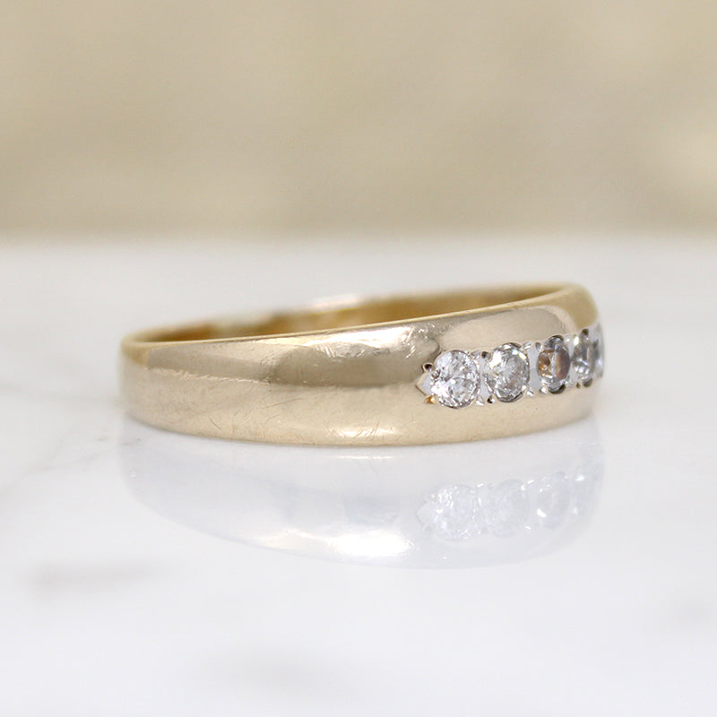 This tasteful gypsy-style diamond band is a Mid Century gem. The 14k gold band is a soft, tapered half round. Five diamonds are inset across the top of the ring, bead-set in crisp white gold. The bright and sparkling stones have a .40tcw. Glossy gold and glittering diamonds, we rarely find a luxurious ring like this in a large size. Circa 1970.