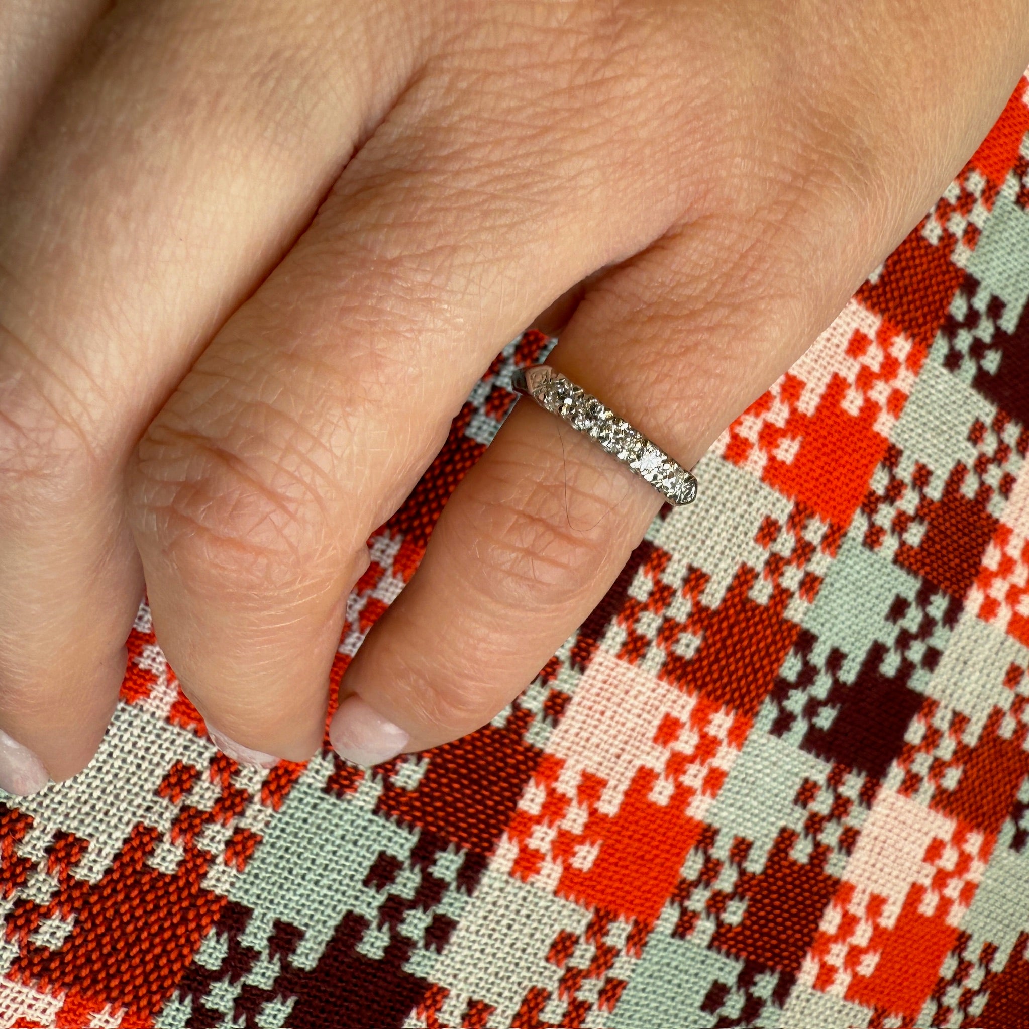 A timeless platinum wedding band, with five sparkling diamonds curving across its top. The row of diamonds is bracketed by engraved fishtail shoulders and a tapered knife edge shank. In profile, the ring displays a pretty scalloped gallery. Perfect paired with your vintage engagement ring. Circa 1940.