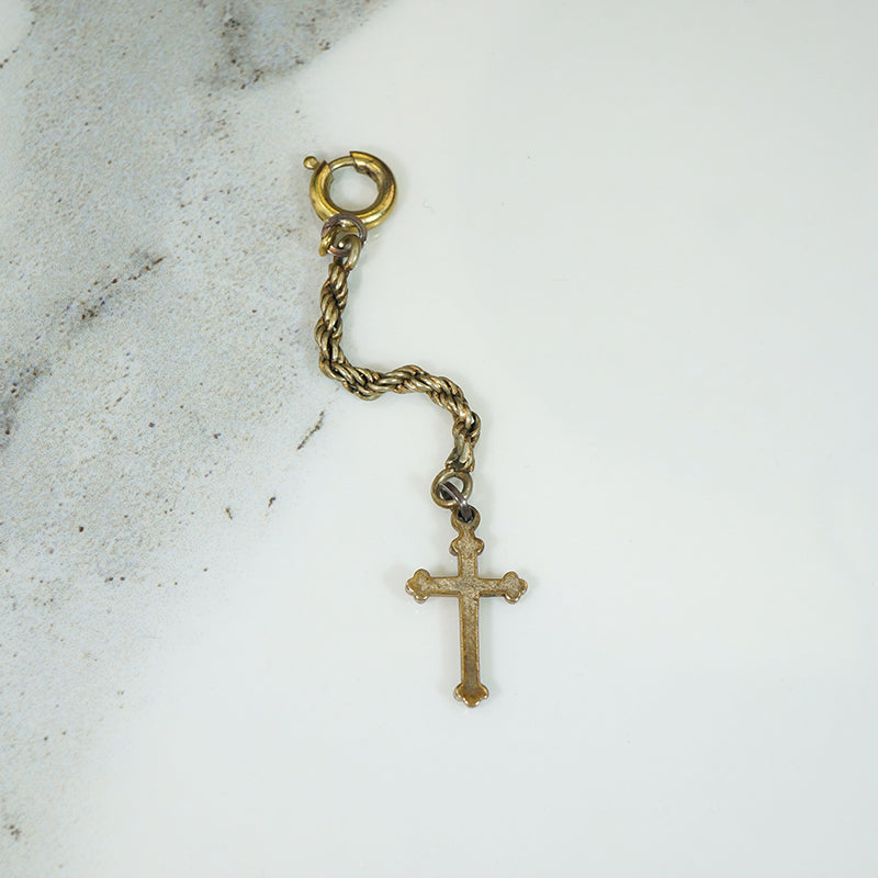 A gold-filled twisted rope chain holds a tiny cross all attached to a little bolt ring ready to attach to your chain. The ingredients date to circa 1920.