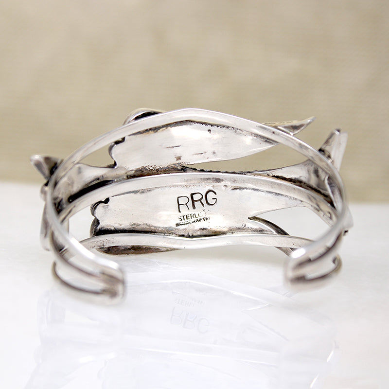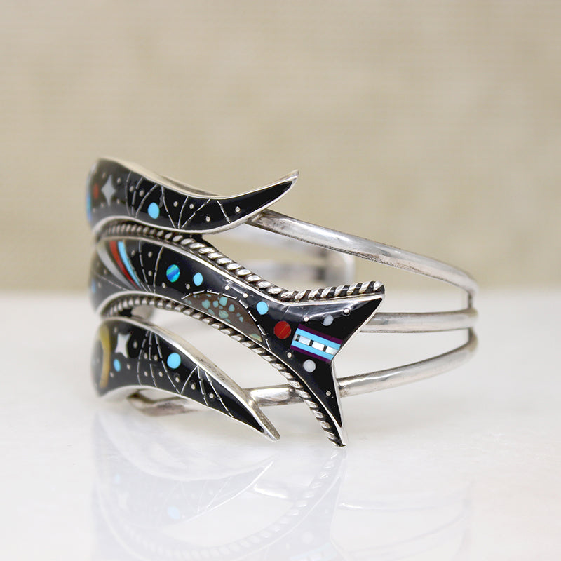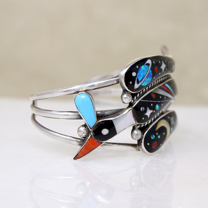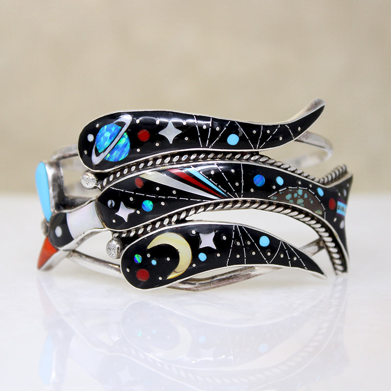 This vibrant and vivacious sterling silver cuff bracelet depicts a bird in flight, its wings and body inlaid with a galaxy of colorful hardstones. This piece was hand crafted by Filipino artists Ronnie and Ramil Glodove. The bird curves across the top of the wrist, suspended on a three-bar cuff. Meticulous black onyx, coral, turquoise, mother-of-pearl, opal, and sugilite lapidary work creates moons, stars, planets, and other celestial bodies. The interior is marked "RRG" for Ronnie and Ramil Glodove. Circa 1990.