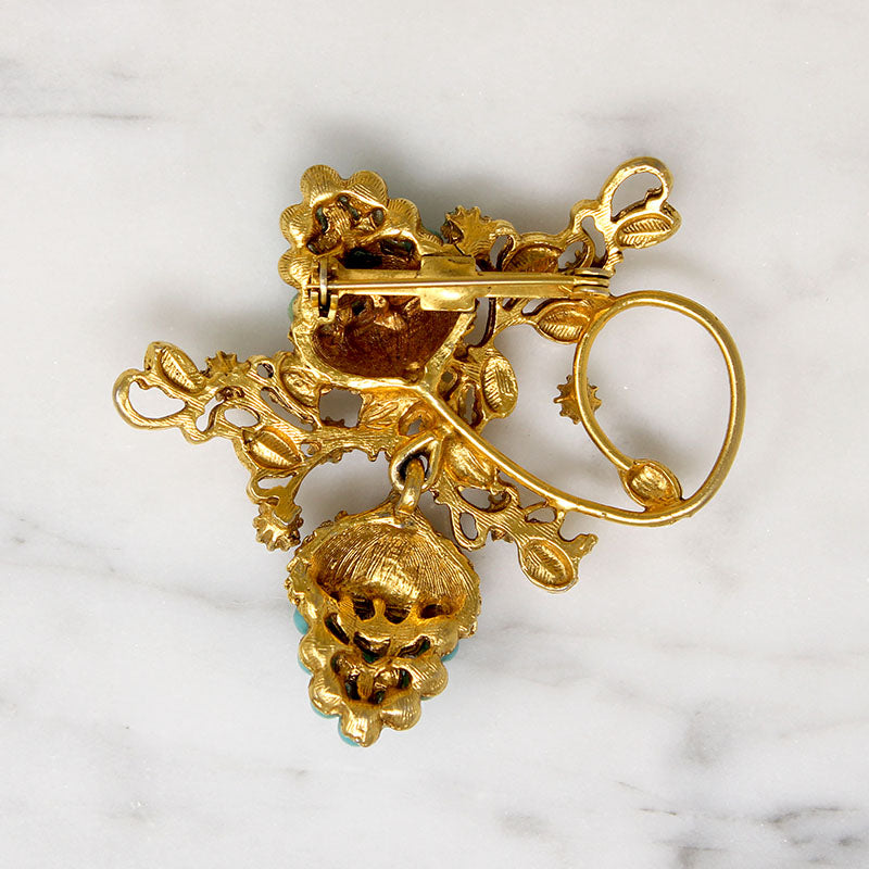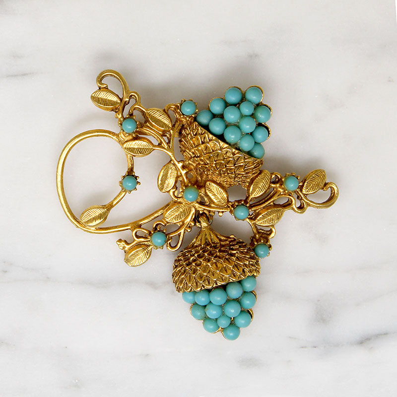 A Victorian Revival brooch with a charming acorn motif. Clusters of faux turquoise cabochons form the nuts, set beneath exquisitely sculpted gold-tone caps. Delicate tendrils and tiny leaves curl around the pair of acorns. Another unsigned work of art. Circa 1950.