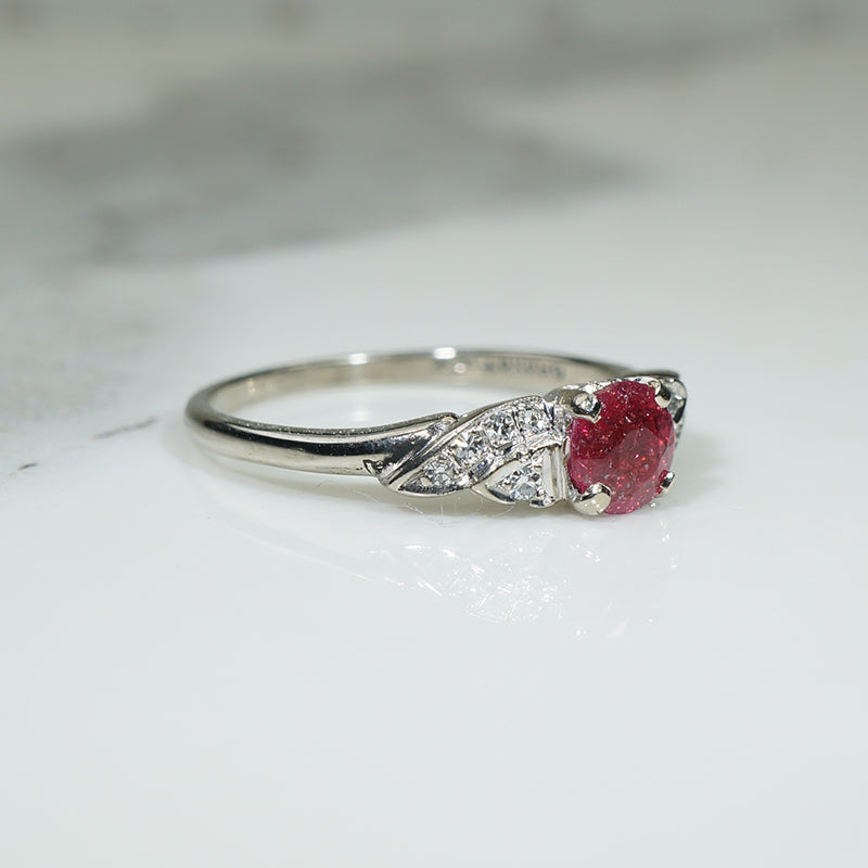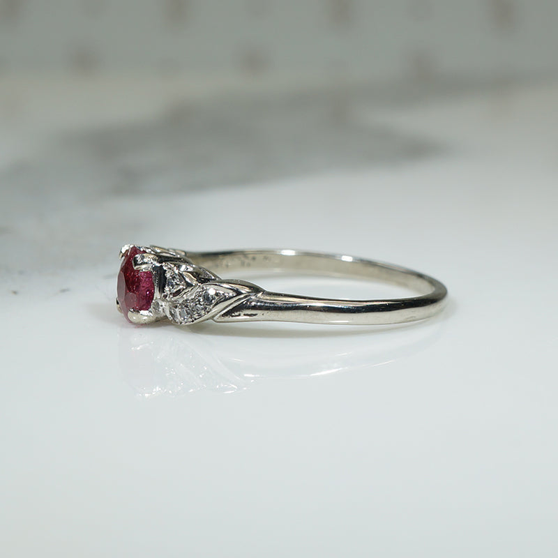 Set in the center of this striking engagement ring is a red tourmaline, to either side in asymmetrical swoops are five pretty diamonds. This ring is pretty from every angle and well made like all Granat rings. This timeless and unique engagement ring is 18k white gold and signed inside the band GRANAT. Circa 1930.
