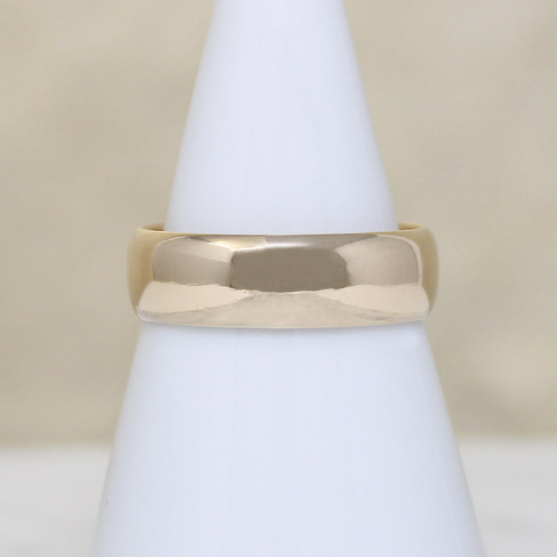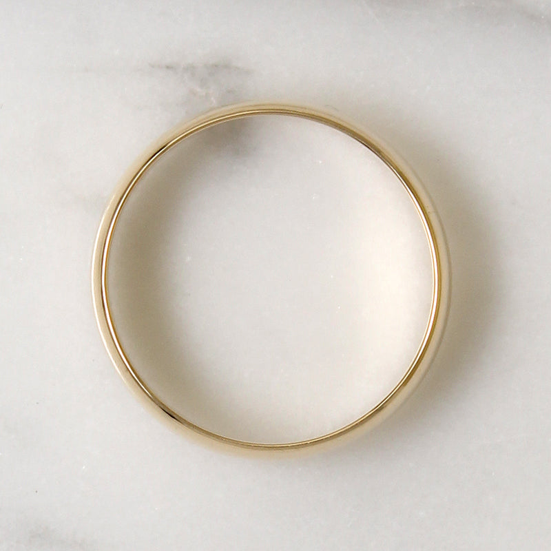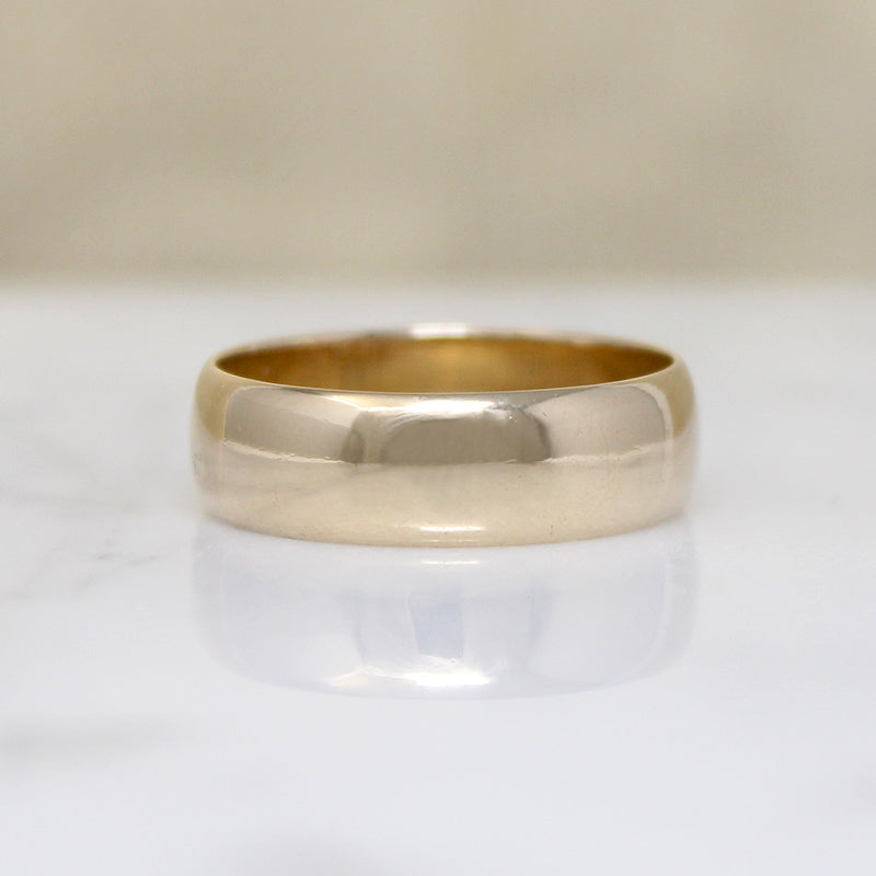 This vintage 14k gold wedding band is signed Wed-Lok. The band has a half-round exterior and a flat interior, giving the piece substance without being too heavy. Its 6mm width is very popular, particularly with men. The interior is marked "14kt Wed-Lock" in a pretty script. Circa 1960.