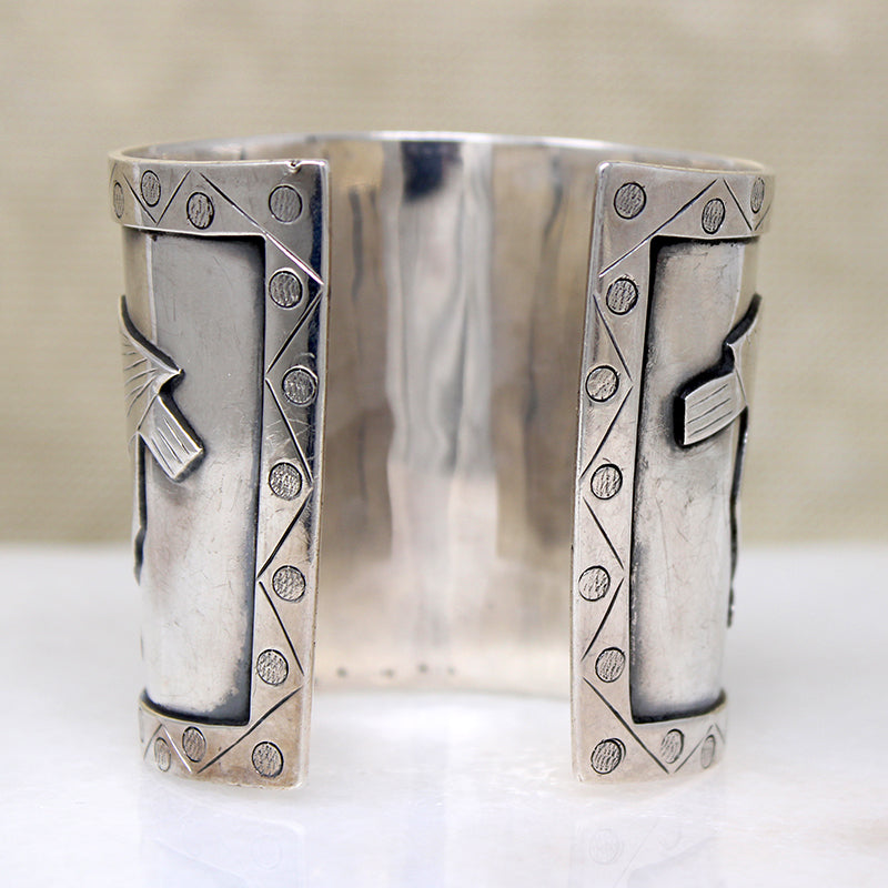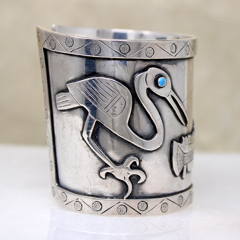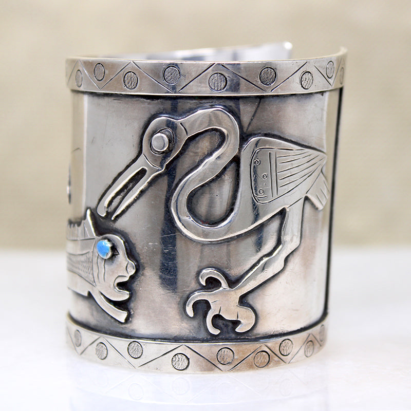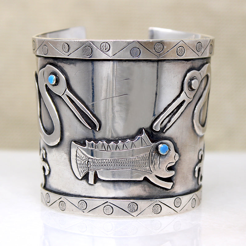 This Peruvian cuff bracelet depicts a natural scene. The cuff is a wide, flat, sterling silver band that curves around the wrist; two birds and a ... lizard-fish creature are applied to the highly polished field. Small blue cabochons depict two of the animals' eyes. A circle and zigzag motif runs along the bracelet's edges. The cuff's interior is marked "925 Peru." The lizard-fish's days are numbered, those birds look hungry. Circa 1950.