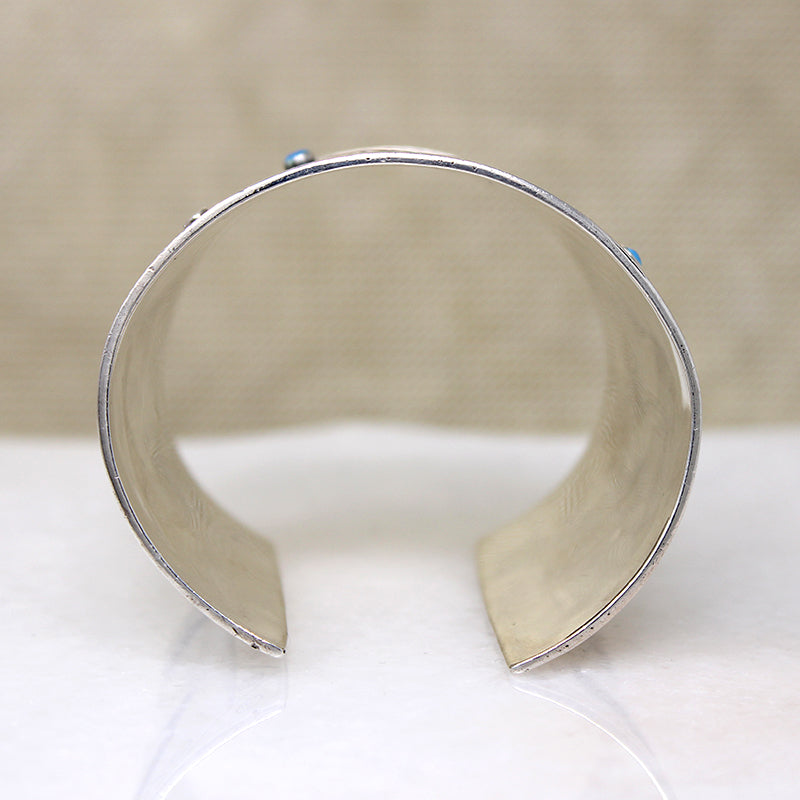 Details.....The cuff is 2.30" wide, its exterior measures 2.37" by 2.05". It measures 2.38" across the interior, with a 7" inner circumference. In Very Good Vintage Condition. All vintage items will show some wear, it is considered part of their charm.