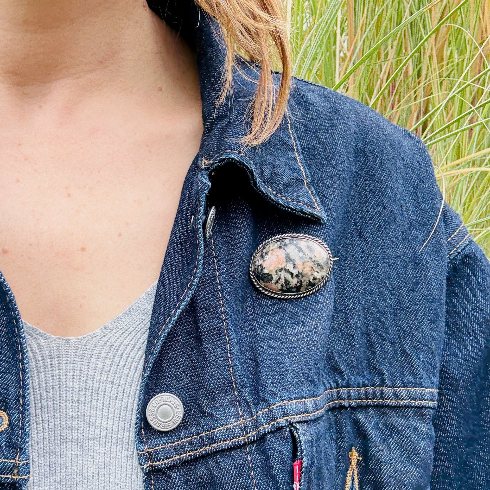 A gorgeous specimen of rhodochrosite is set in this classic Edwardian brooch. The rhodochrosite is cut in a glossy oval cabochon; it's set in a sterling silver bezel, and framed in twisted silver wire. Mottled pink, gray, and black hues give the stone its delicate beauty. The brooch fastens with a c-clasp. There are small flecks of red paint on the stone's back, not visible when worn. Circa 1900.