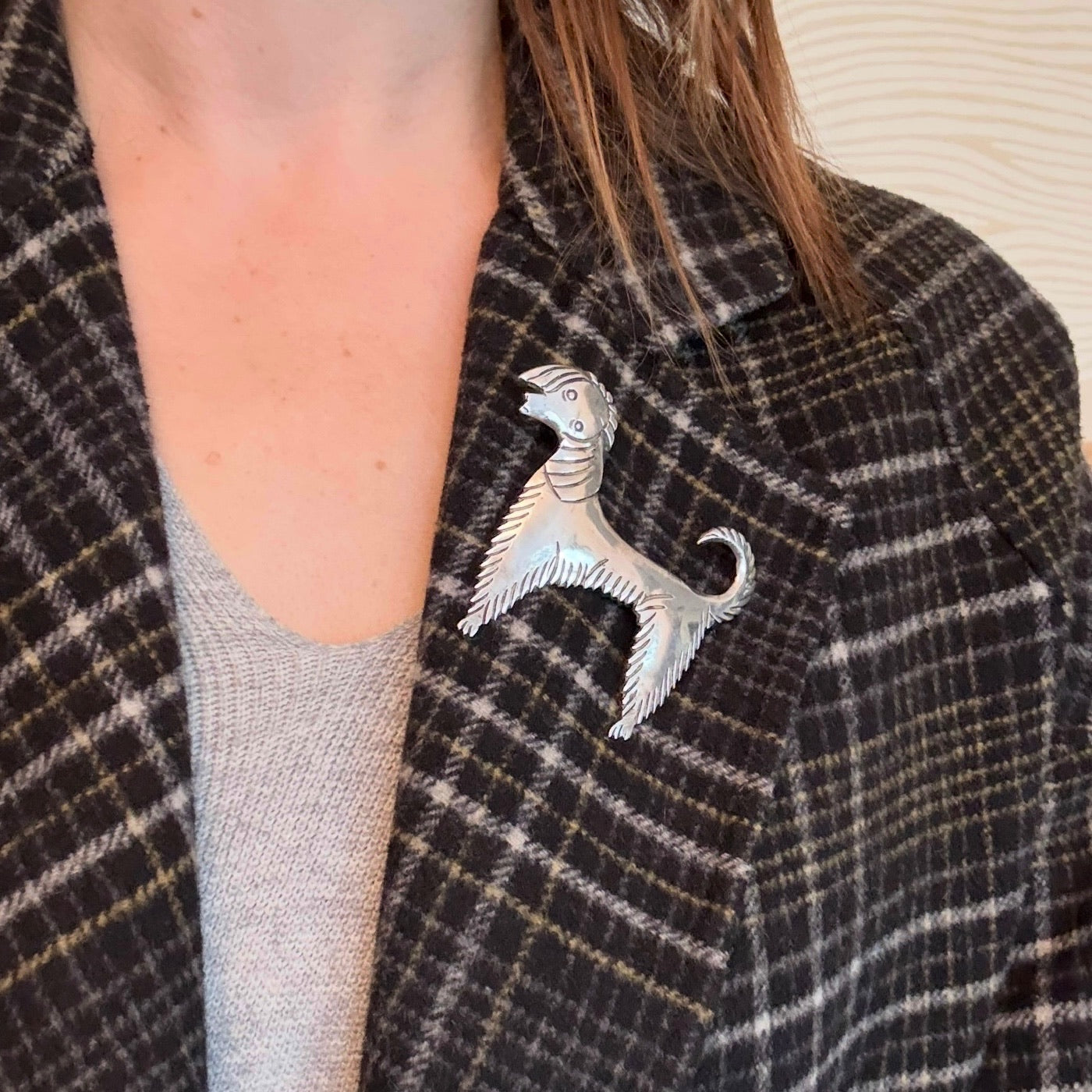 What a good girl! This naive silver brooch conveys great charm using few details; the sweet dog's tail is wagging and her head is cocked, as if she hears her person calling her name. Is this an Afghan Hound, perhaps? The brooch fastens securely with a rollover pin. Stamped "Mexico Silver" on its back. Circa 1940.