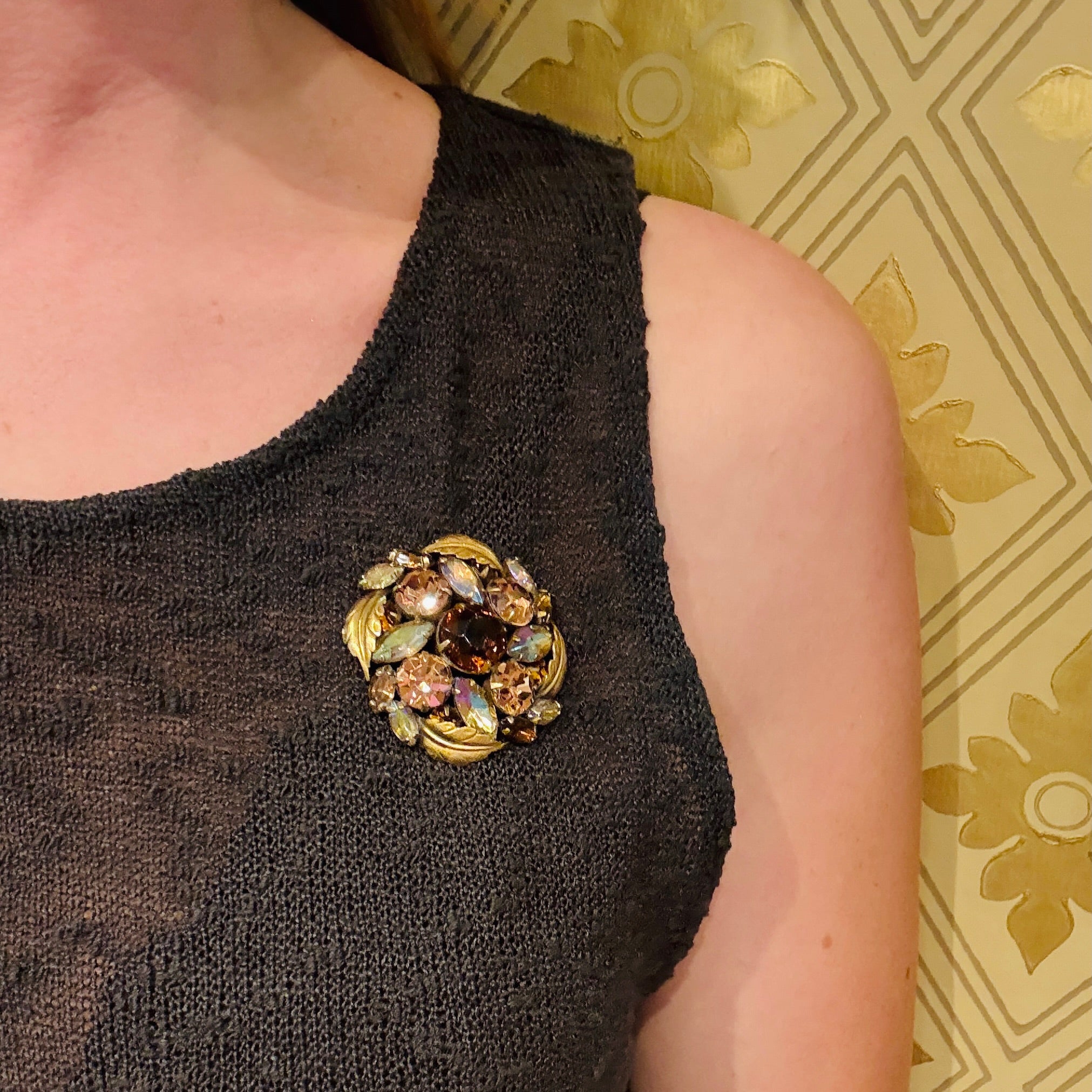 Mid Century Root Beer & AB Crystal Brooch