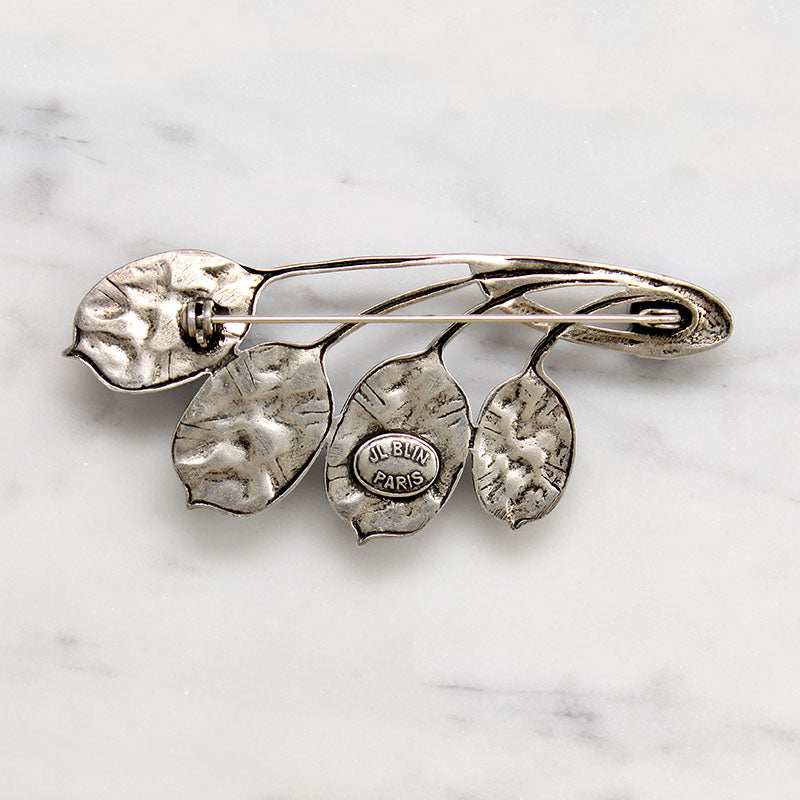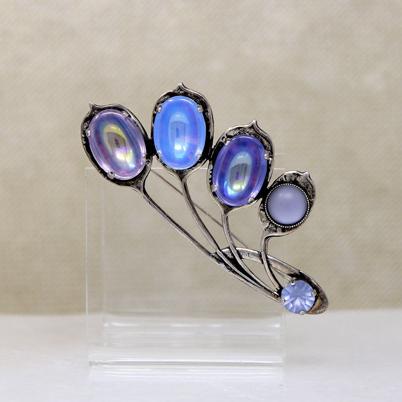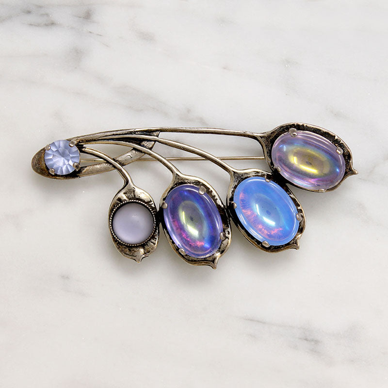 This French Art Nouveau-Style brooch is fabulous, it truly embodies the magic of an earlier era. Delicate natural forms reminds us of a certain René we all know. Iridescent glass cabochons radiating blues, pinks and purples glow in this lovely silver-tone piece. Understated details slowly unveil themselves, I won't give it all away. Signed "JL Blin Paris" on the back. Circa 1980.