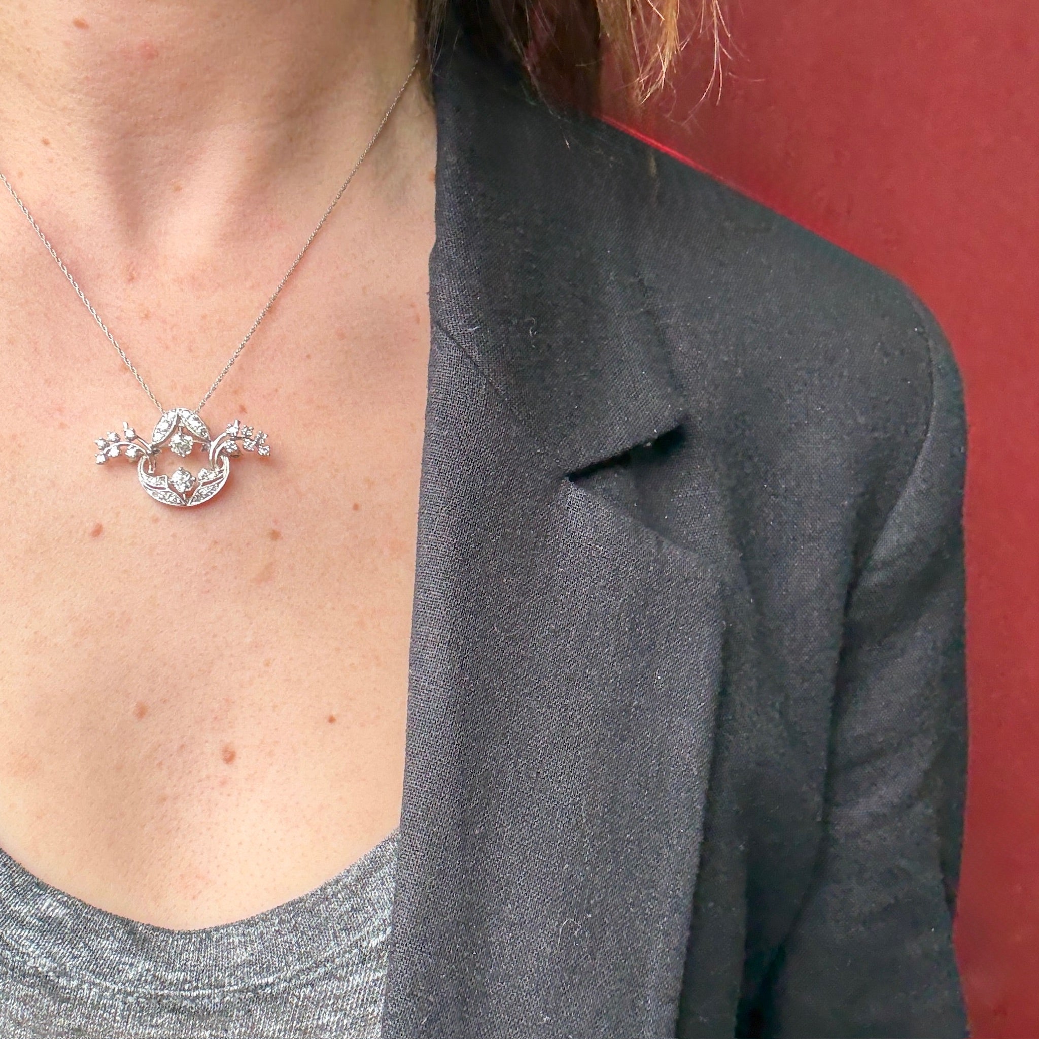 This fun and fanciful 14k white gold jewel can be worn as a brooch or a pendant. With the sprays of diamonds arcing on the sides it is reminiscent of a fountain. Beautifully made and set with Old European cut diamonds, it comes with its chain.Circa 1930.