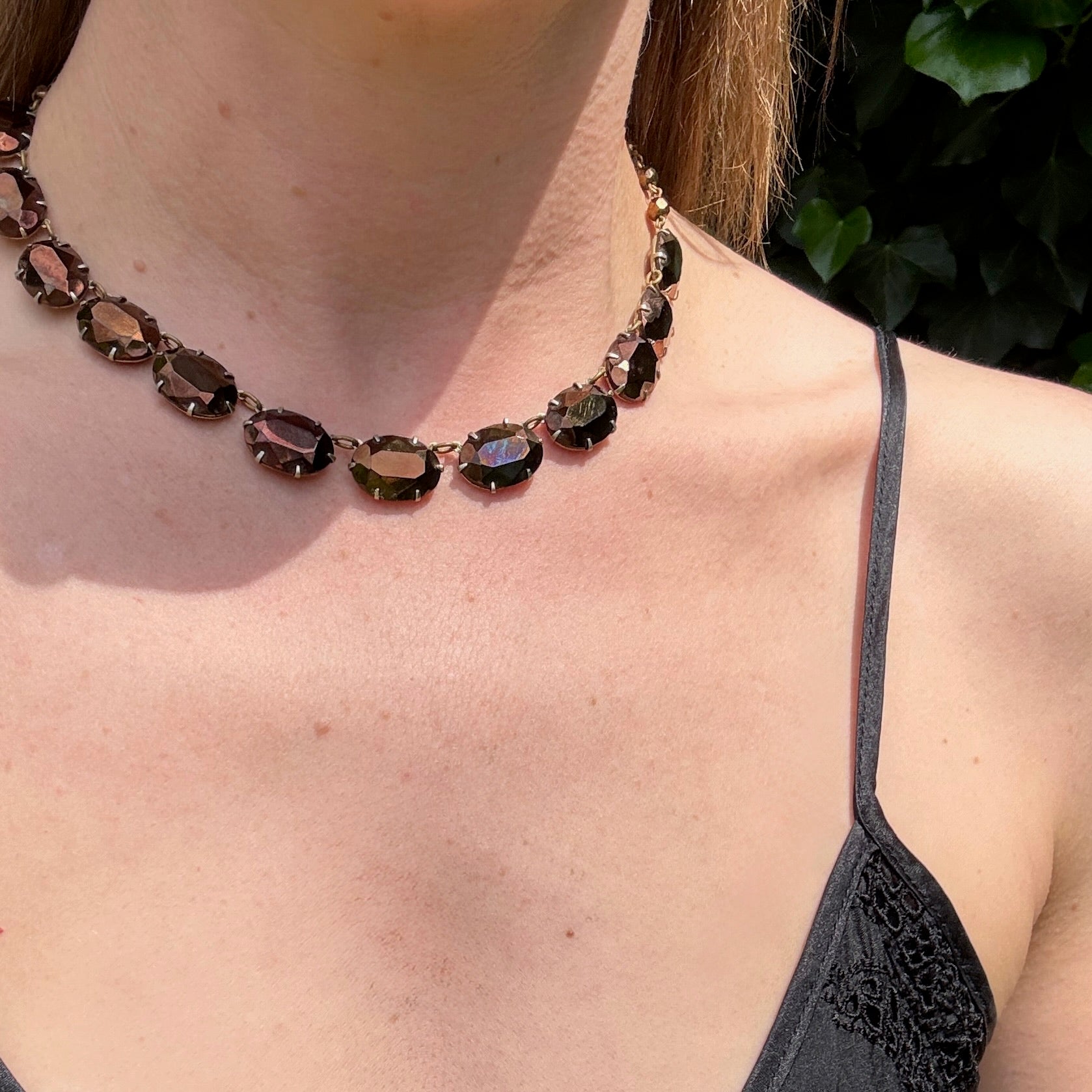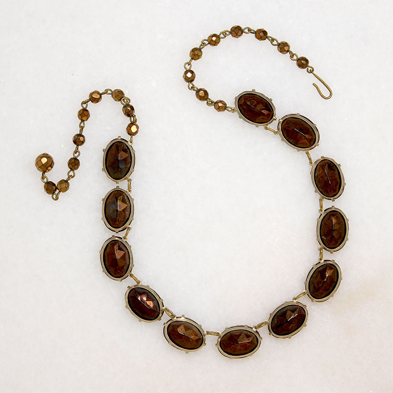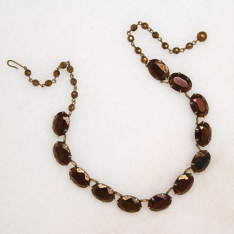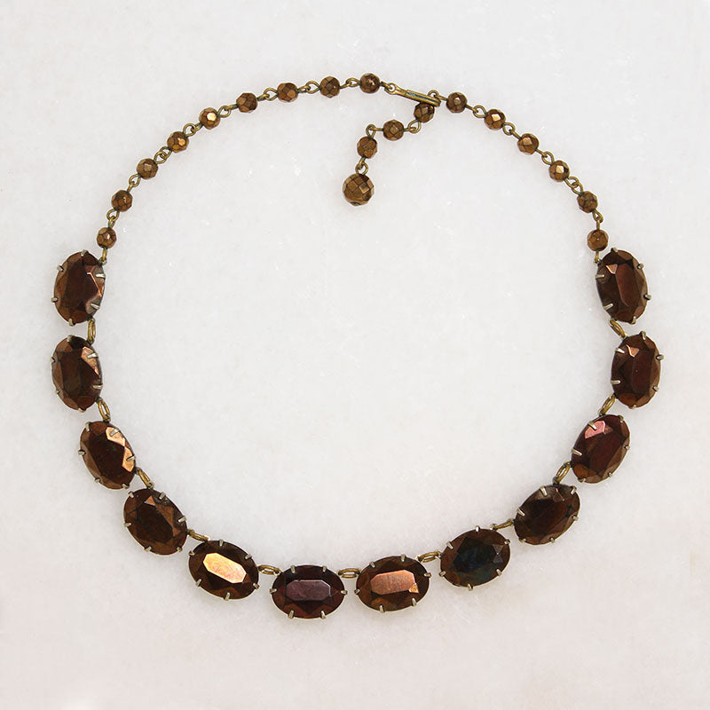 A mesmerizing rivière necklace, set with gorgeous bronze glass gems. The oval faceted stones are prong-set horizontally in gold-tone costume metal links; the links are open-backed and lightweight, allowing the metallic glass to be exquisitely illuminated. The necklace fastens with a hook and extender chain clasp set with small bronze beads. This piece combines simplicity with drama in the most delightful way. Circa 1940.