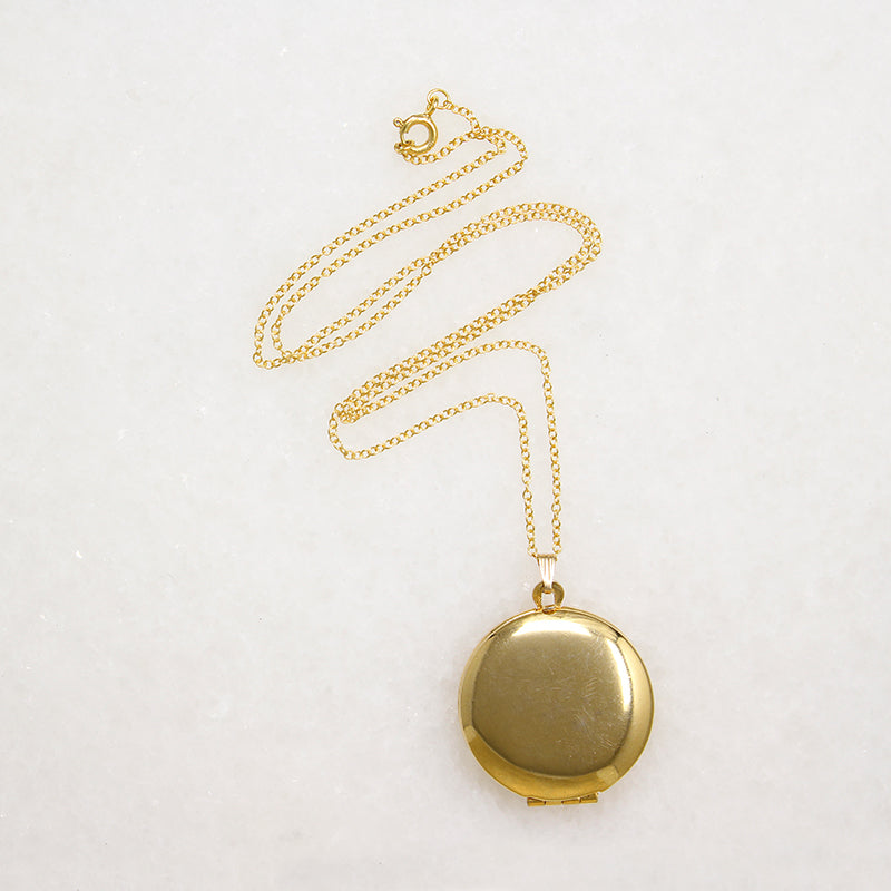 A shiny round gold-tone locket, highly polished on front and back. It is hinged on the bottom, opening to reveal a clean interior with no glass. A pinch bale suspends the locket from a gold fill cable chain. Simple and sweet. Circa 1980