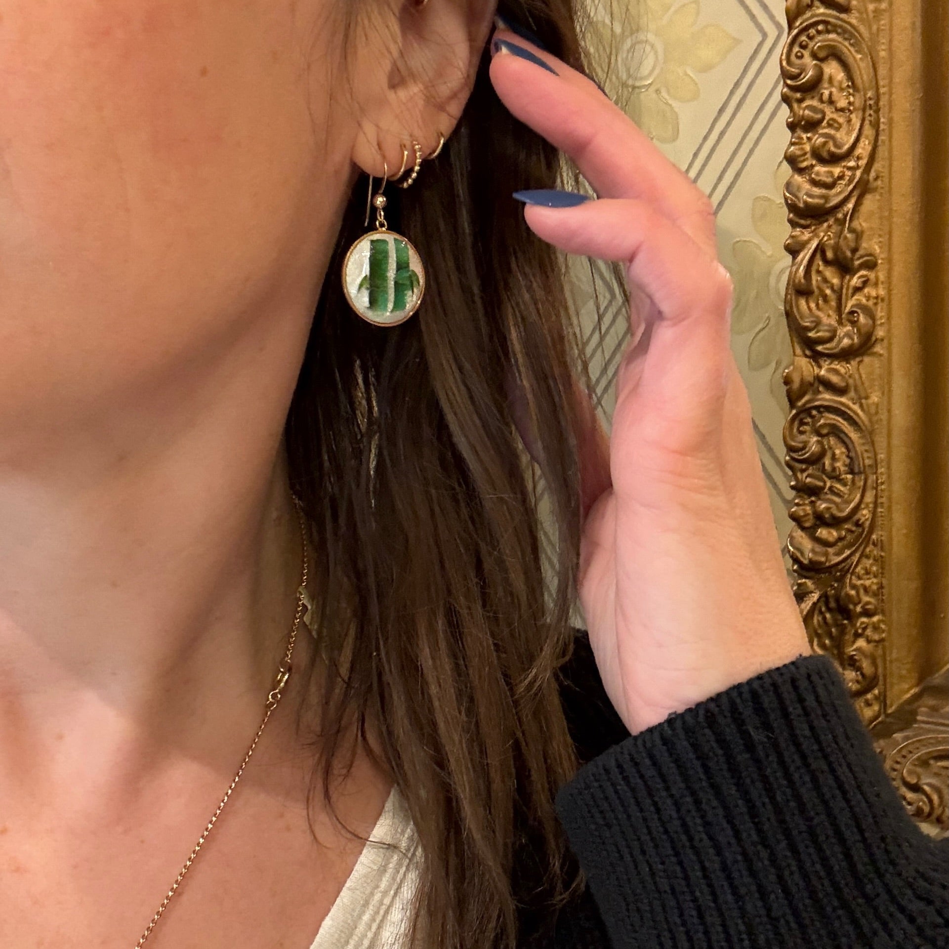 Fun and flirty earrings enamelled with bright green bamboo stalks. The bamboo appears on a discs of white enamel, set in gold filled metal bezels. The discs hang on gold fill French ear wires. Circa 1980.