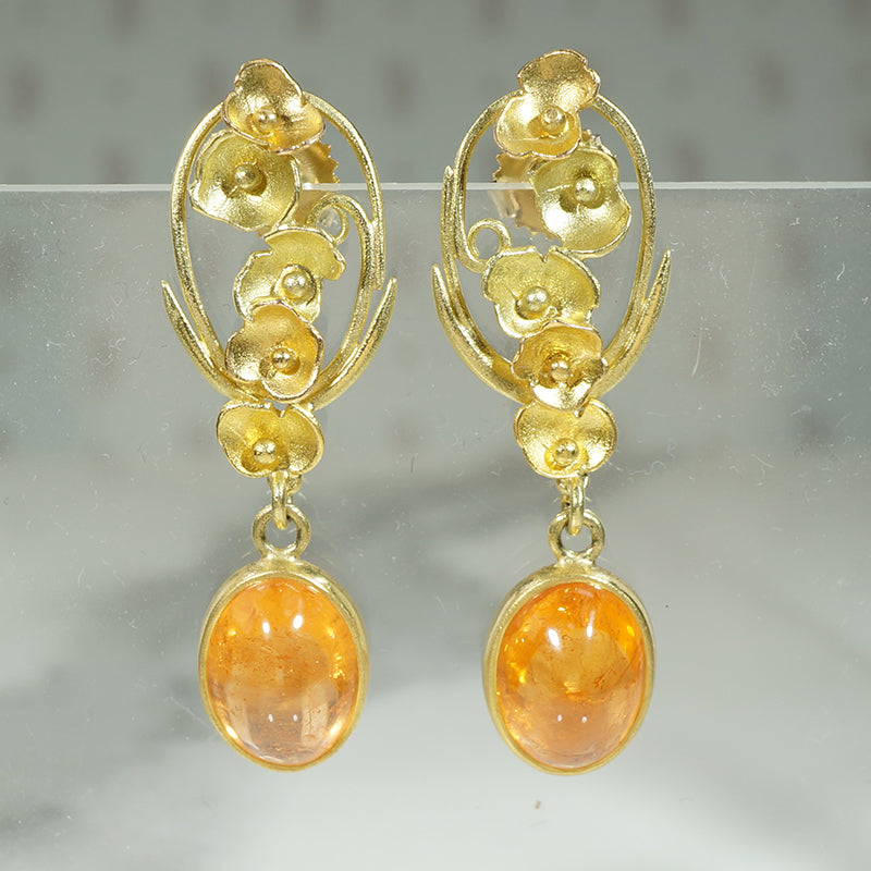 These earrings are so lovely.The top is comprised of a meander of flowers in yellow and green gold suspended from the flowers are cabochons of brilliant orange spessartite garnets. Handmade estate jewels in 18k gold.