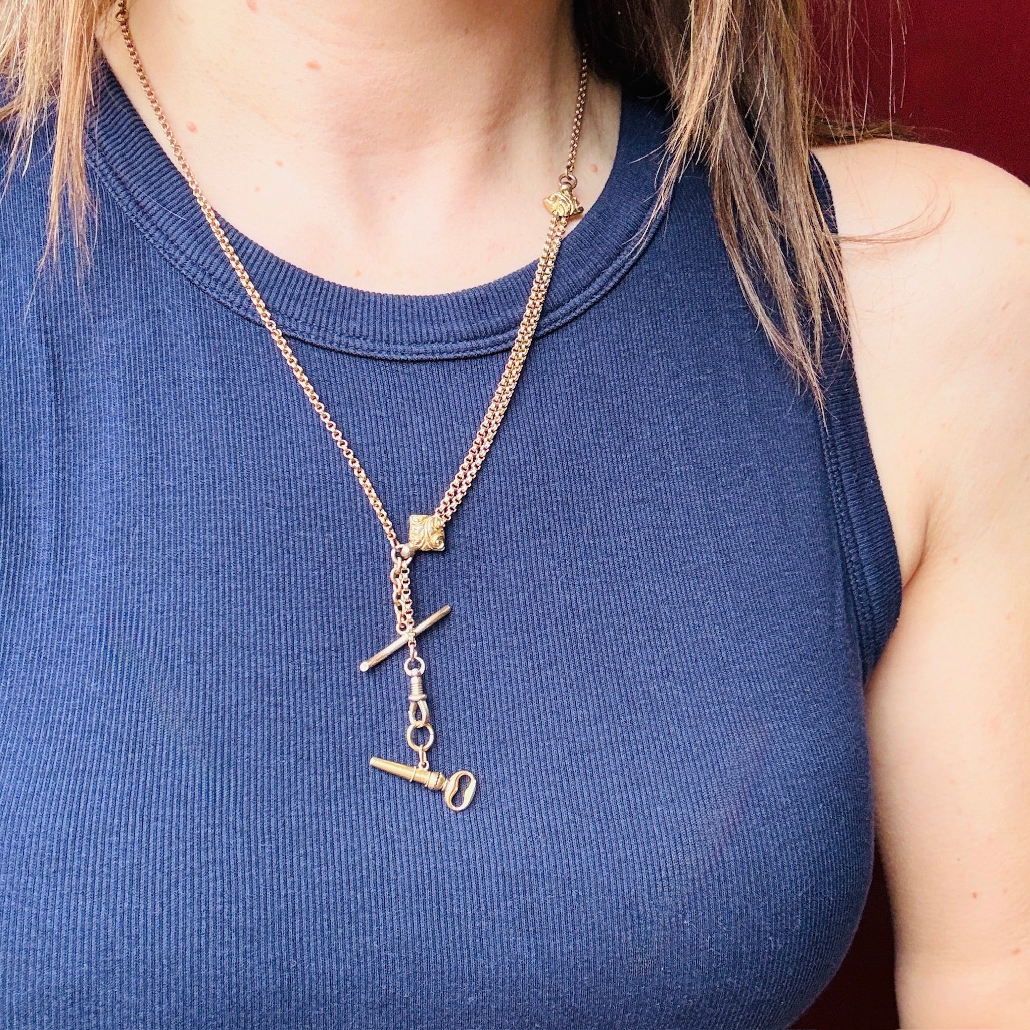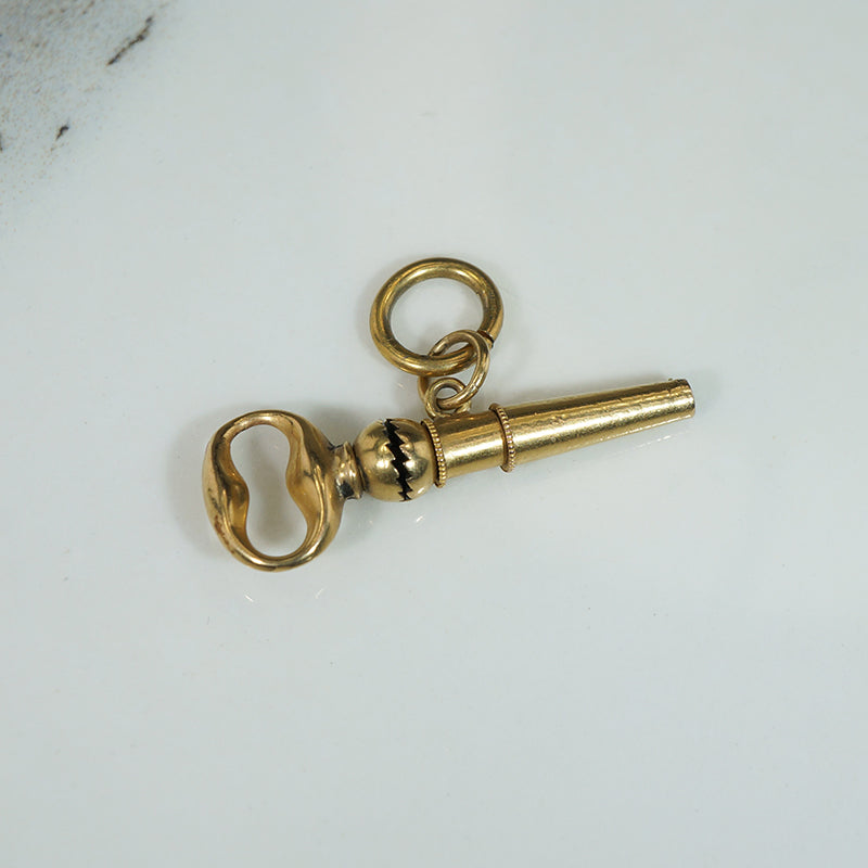 Before watches were wound by twisting the stem, a key (like this one) was fitted to a gear at the back of the watch to wind the piece. Since it was necessary to carry this key with the watch, these keys often took fanciful forms and were used as decorative fobs worn on watch chains alongside the watches. Now, we wear the lovely old watch keys as pendants.