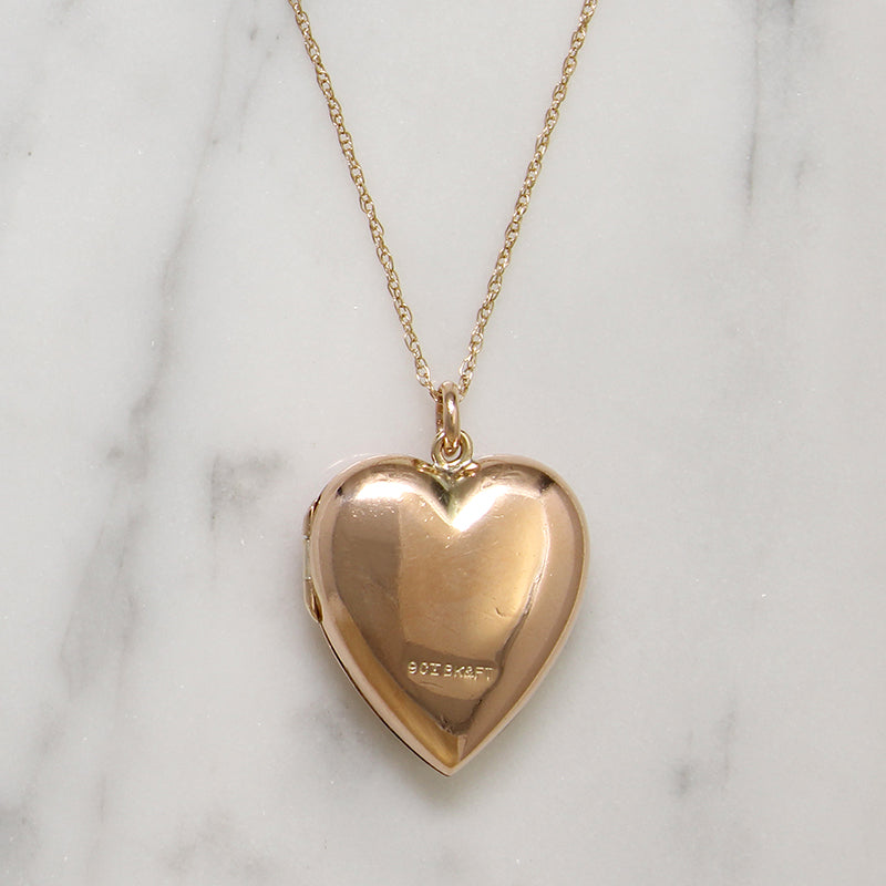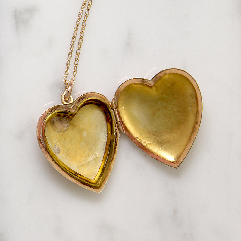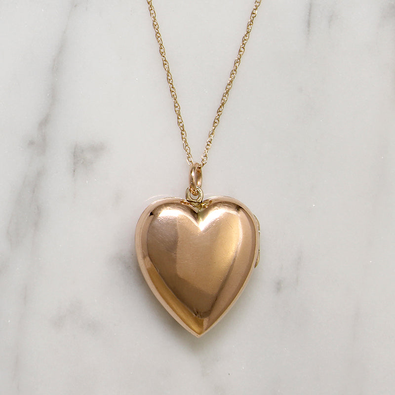 A blushing 9ct rose gold heart locket. This sweet Edwardian belle is simply perfect, highly polished front and back. Its interior is clean with no frames, and it has a tight closure. The back is marked for 9ct Back & Front. A jump ring has been added to the bale, suspending the heart from a recycled 10k rose gold chain. Circa 1900.