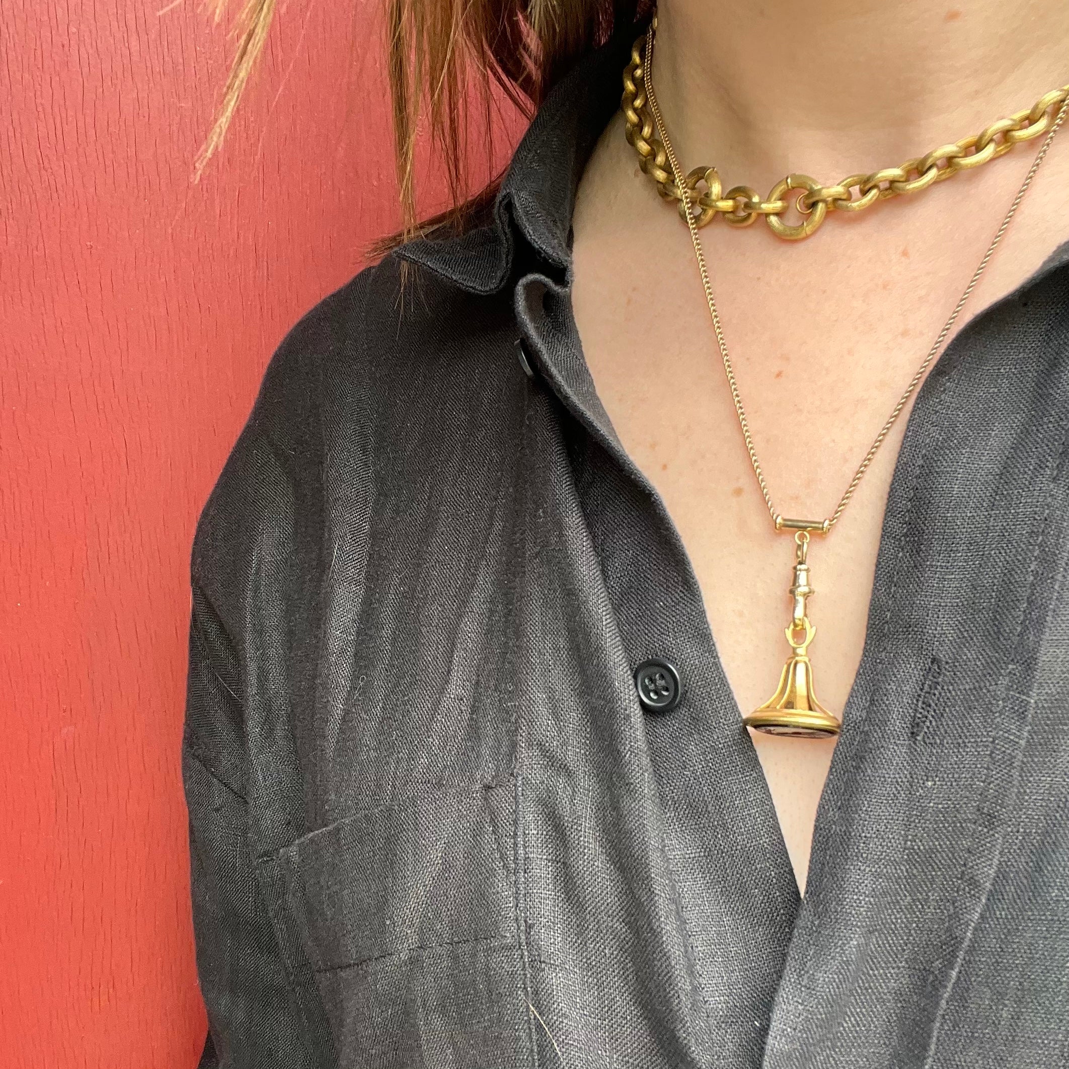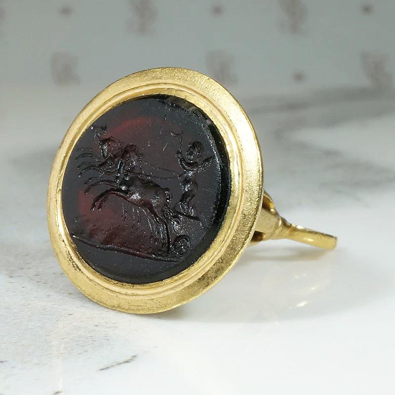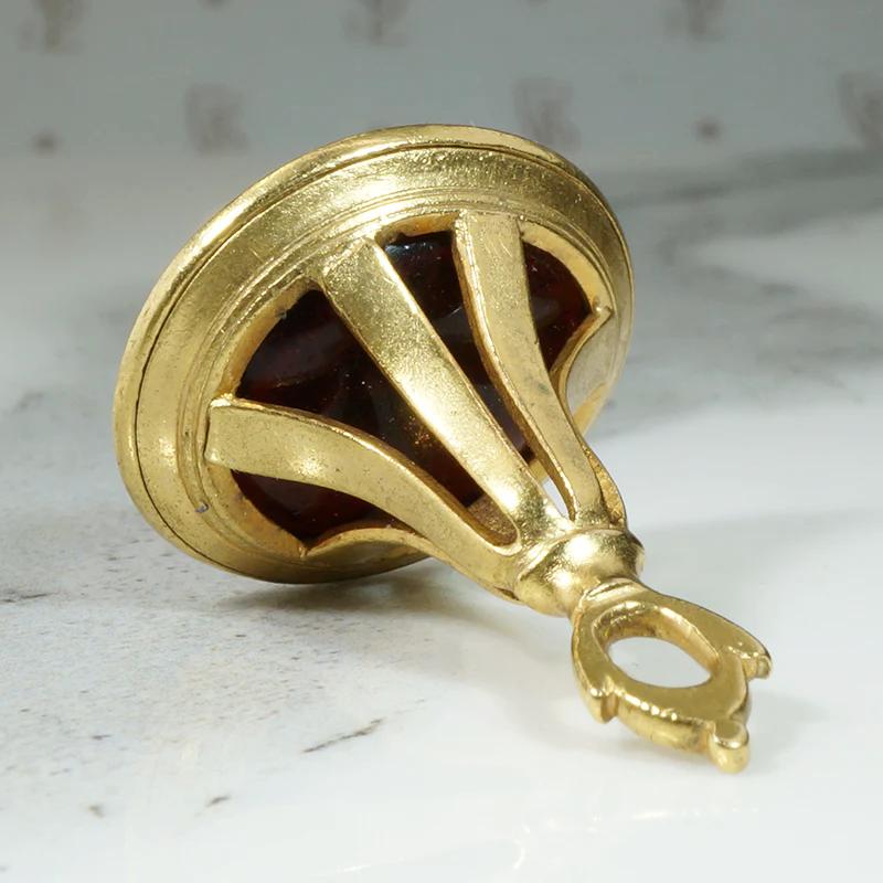 An extraordinary Georgian watch fob featuring a garnet intaglio. The garnet colored glass is carved with the lively image of Cupid driving a chariot. The God of Love rides in a quadriga, a chariot drawn by four horses abreast, favoured for chariot racing in Classical Antiquity and the Roman Empire until the Late Middle Ages. The intaglio is bezel set at the base of an elegant Pinchbeck fob. Pinchbeck is an ingenious alloy invented in the 18th century to imitate high carat gold. The fob's graceful Neoclassical design and dramatic carving makes it a wonderful choice for a pendant. Circa 1820.