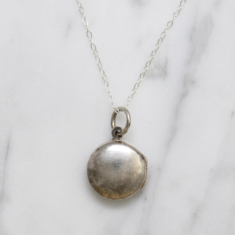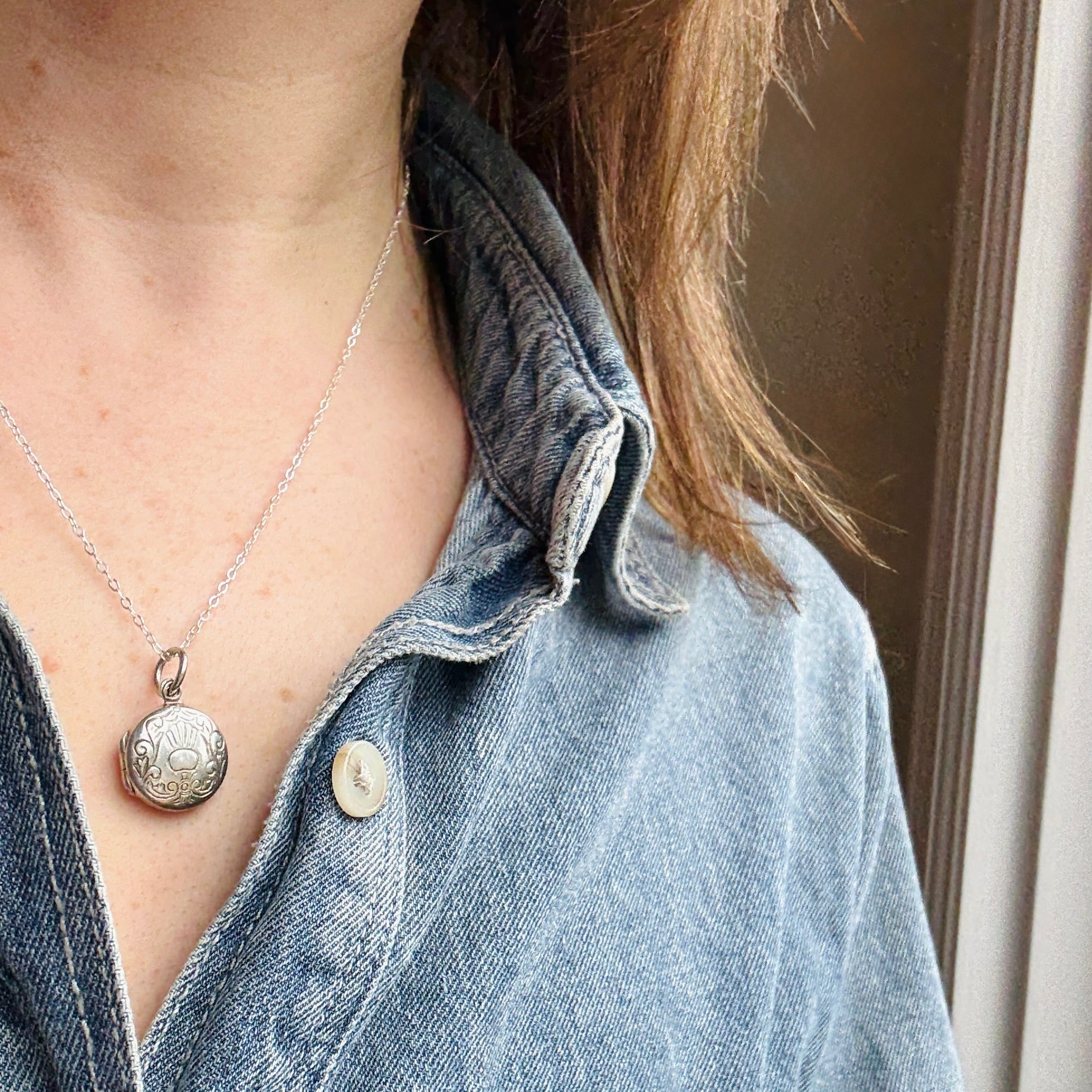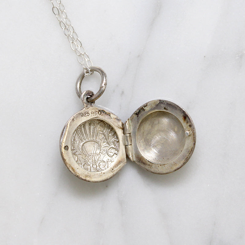 This darling little sterling silver locket is engraved with an unusual design. The front is incised with flourishes, and the back is plain. The interior is clean with no glass, perfect for preserving a small photo or lock of hair. A jump ring bale suspends the piece from a sterling silver cable chain. Circa 1980.