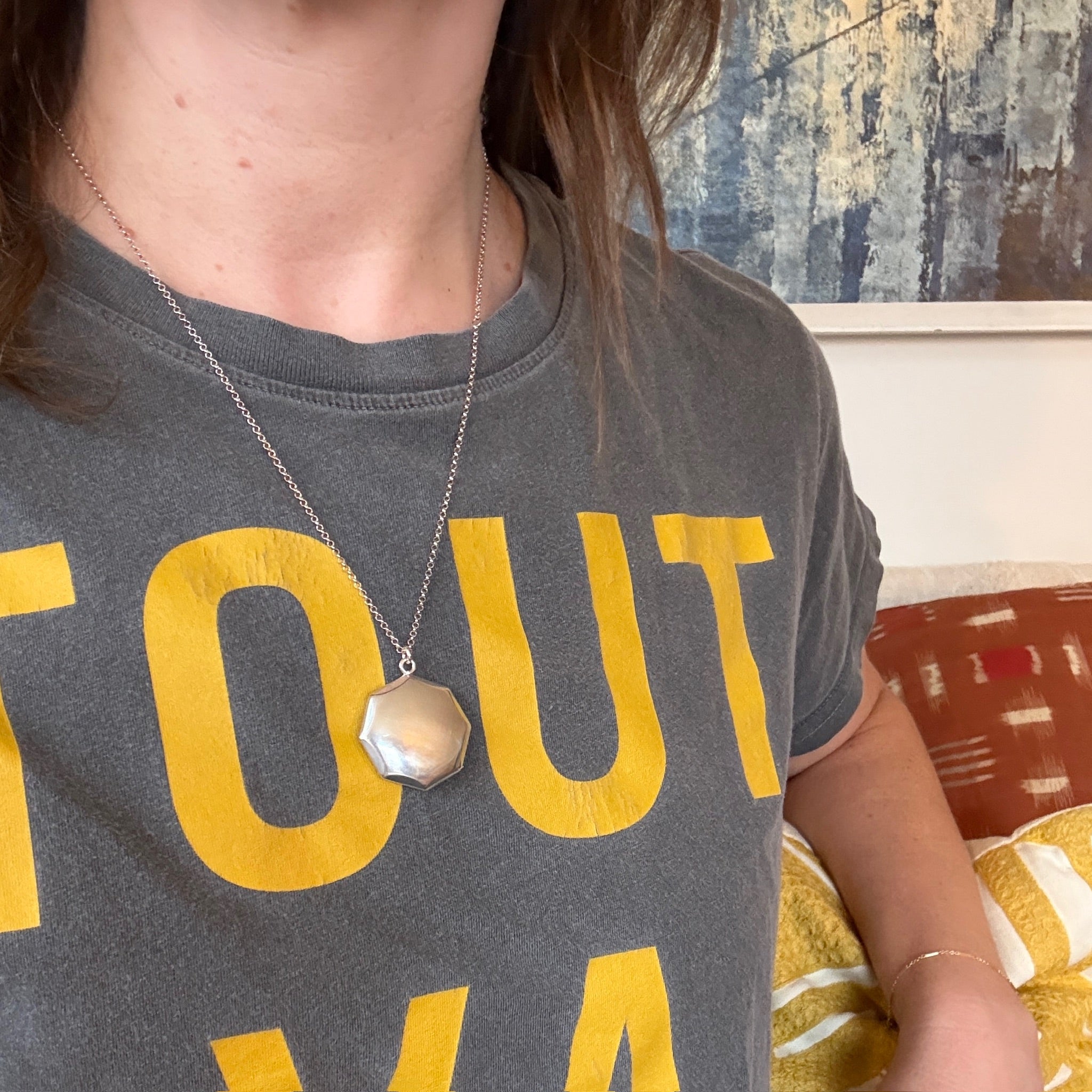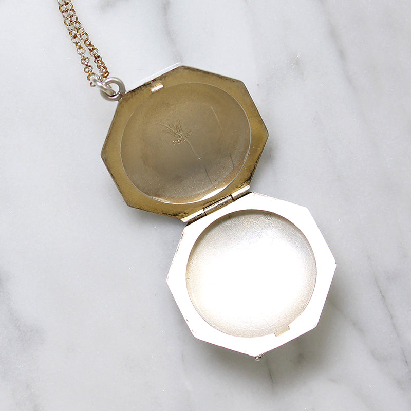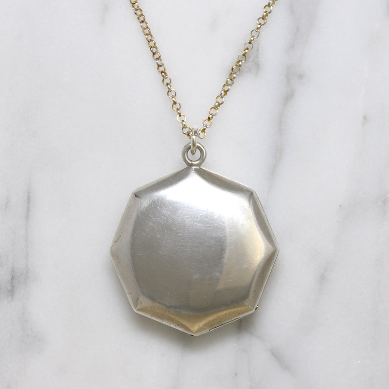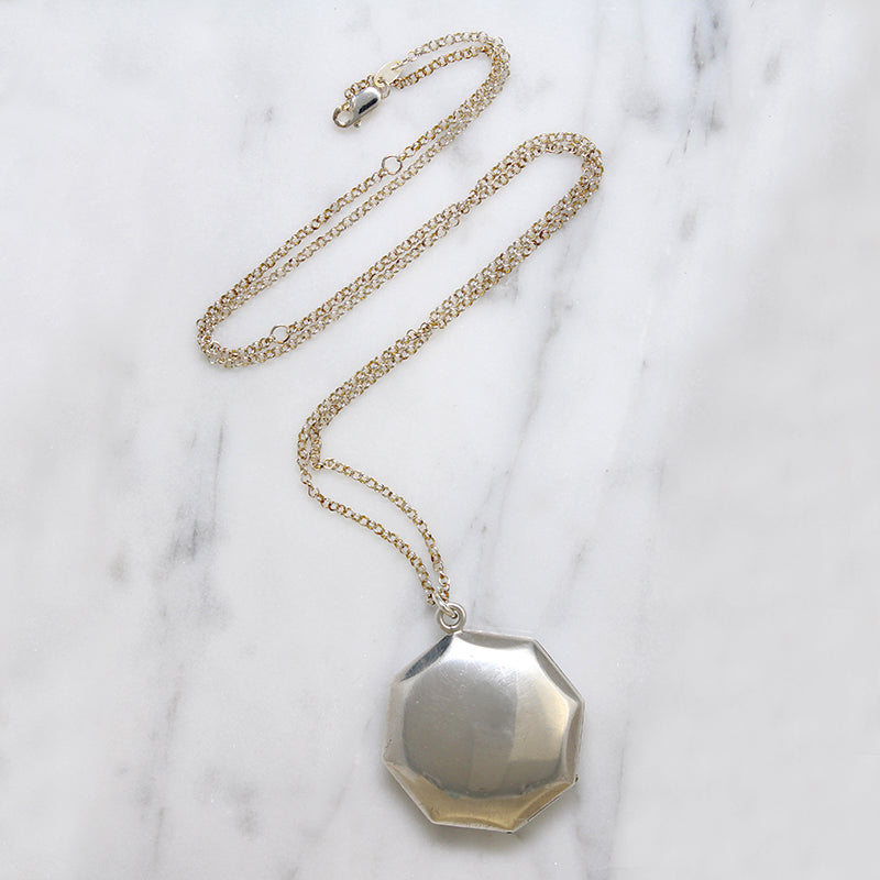 This sterling silver locket is an Edwardian delight. The locket is a domed octagon, with soft angles and edges that create a starry effect. Both front and back are plain and highly polished. A jump ring has been added to its bale, and it hangs on a modern sterling silver cable chain with a sturdy lobster claw clasp. The interior is clean and empty; it's stamped "Sterling" and bears the maker's mark for the Wolcott Manufacturing Company of Providence, Rhode Island. Circa 1910.