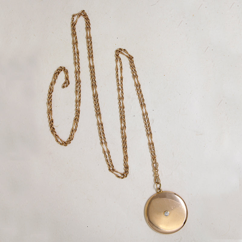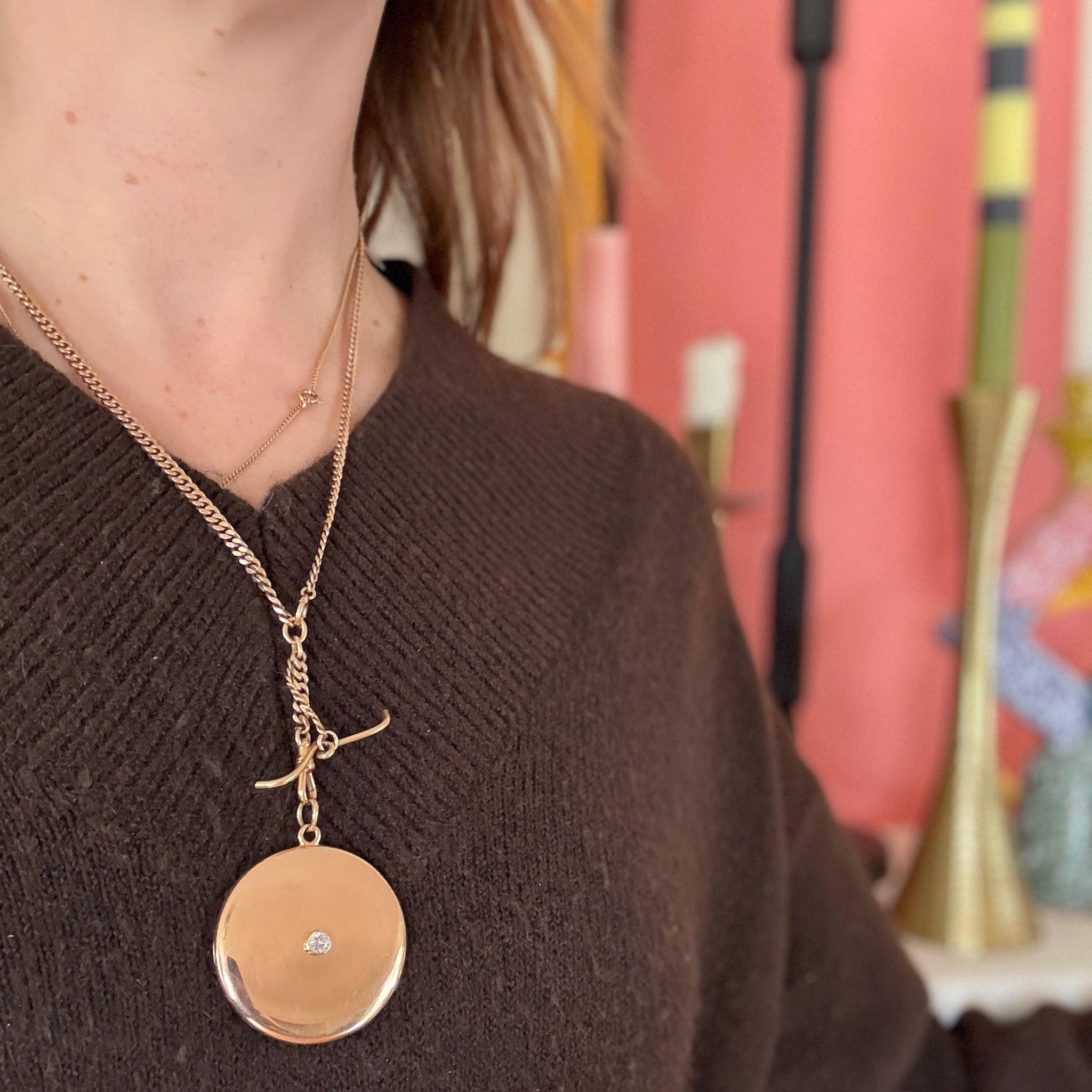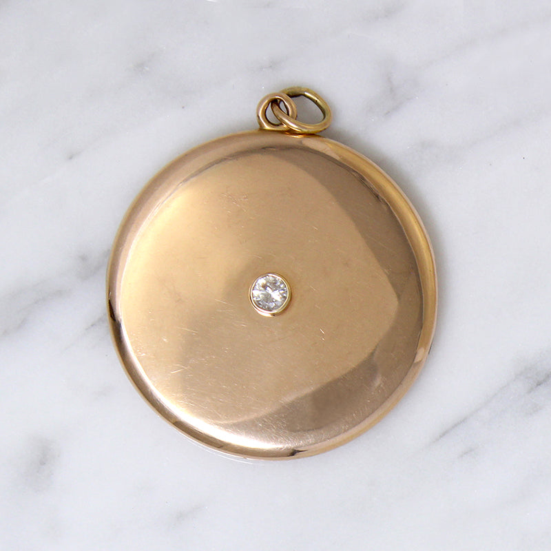 This large, round, gold and diamond locket is the picture of Edwardian elegance. The 14k rosy gold locket has a high-polish front, center set with a bright .35ct diamond displayed in a simple bezel. An elaborately engraved monogram, "PLS" perhaps, is incised on the back. The locket's interior is clean, with original frames and no glass. A jump ring has been added to the bale, making it easy to wear this luxe locket any way you like. Circa 1910.