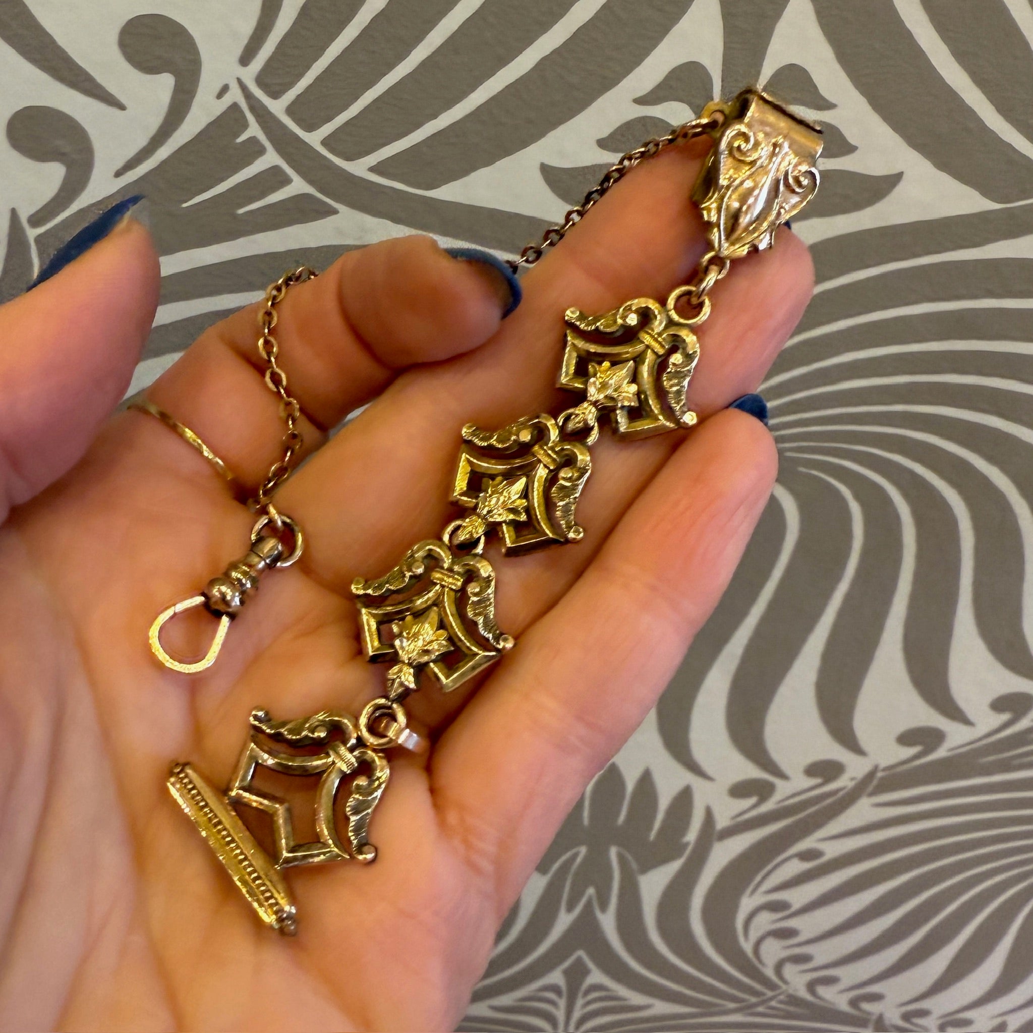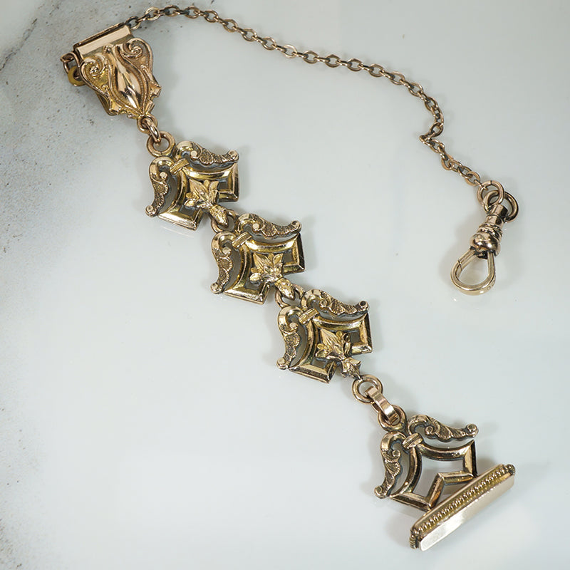 This elaborate Victorian watch pull makes a lovely ornament. Wear it as a pendant, attach it to your belt, hang it from your purse, or ... why not? wear it on your pocket watch. The watch pull is a panel of gold-filled elaborate winged designs. The pull hangs from a gripper hook, and a gorgeous little fob hangs from its bottom. Use the watch hook for a watch or another ornament. Circa 1880.