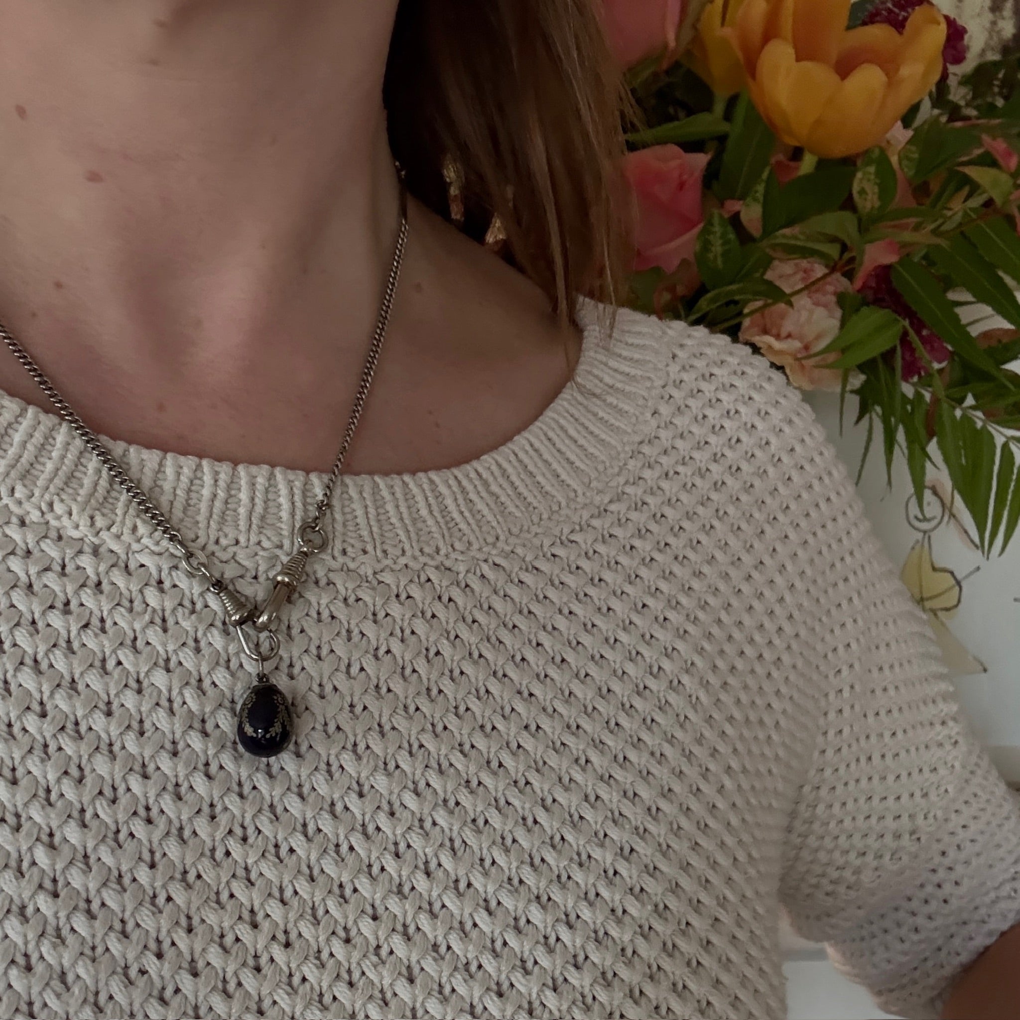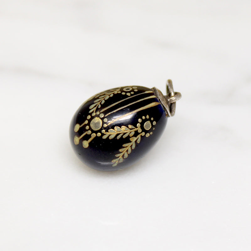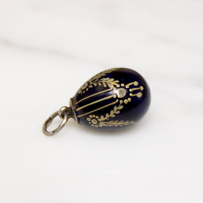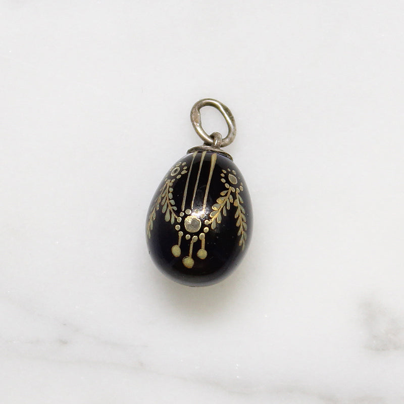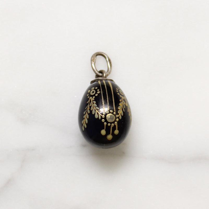A tiny Russian egg charm, in homage to the great Fabergé. The silver gilt egg has a strangely funereal motif, with golden swags on a field of black enamel. A jump ring has been added to the bale for ease of wear, it bears Imperial Russian hallmarks for the years 1890 to 1910.