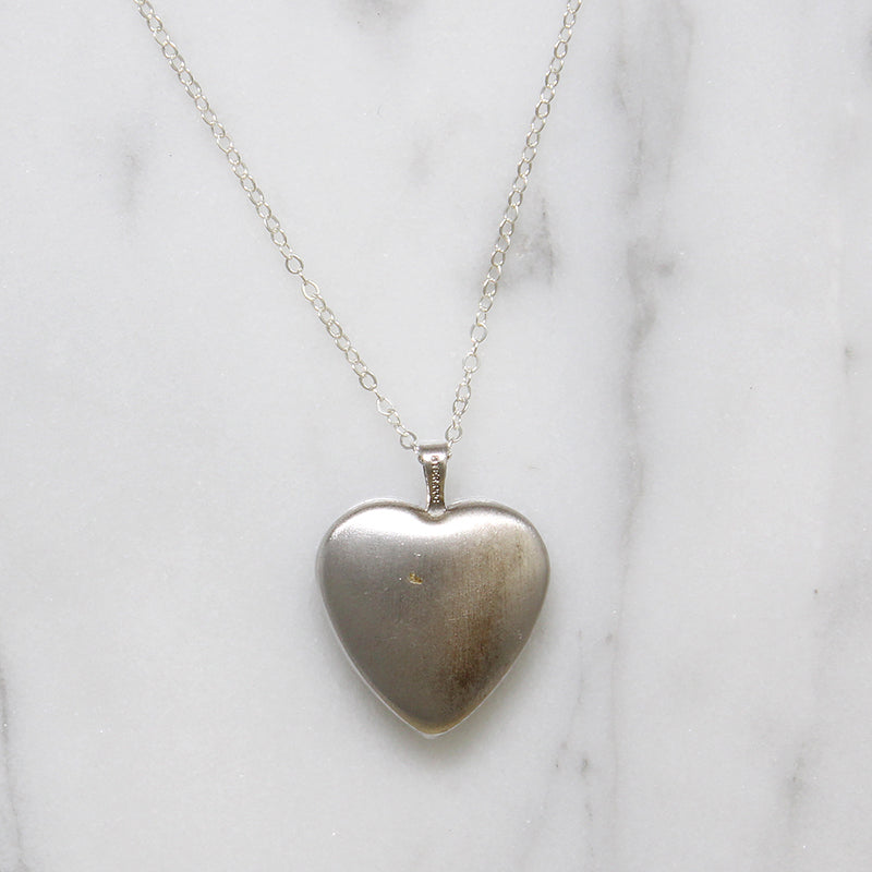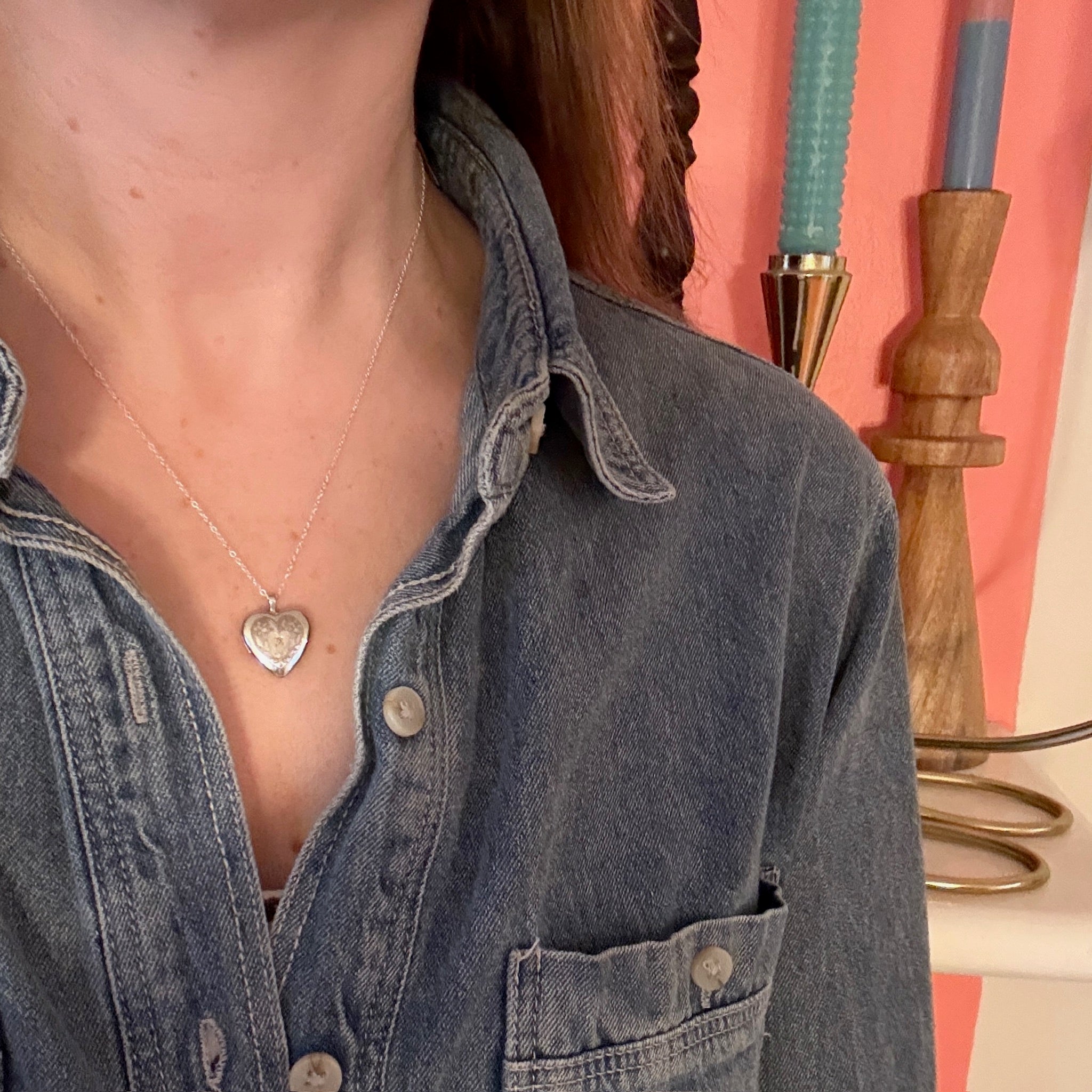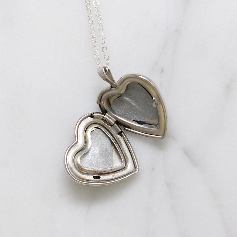 This enchanting little heart-shaped locket is engraved with hearts and flowers, and set with a tiny diamond. The delicate details cover the front of the locket, the back is plain with a soft brushed finish. The interior is clean with two frames, perfect for preserving a pair of special photos. An integrated bale hangs the piece from a sterling silver cable chain. A romantic love token, this style of Mid Century locket is always in style. Circa 1960.