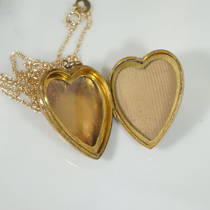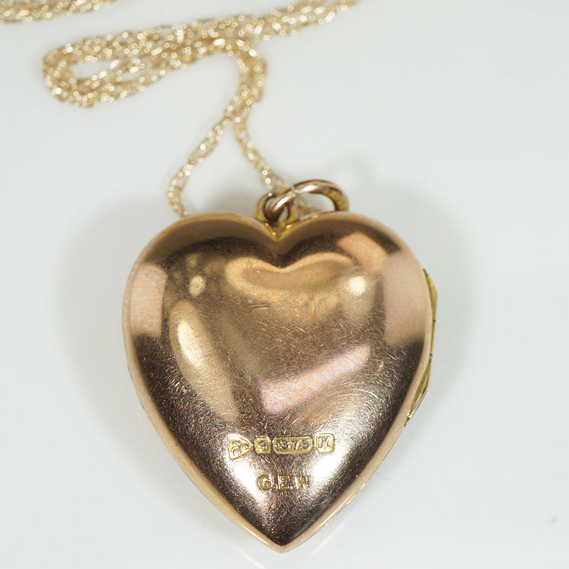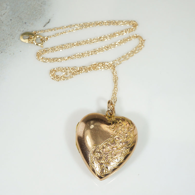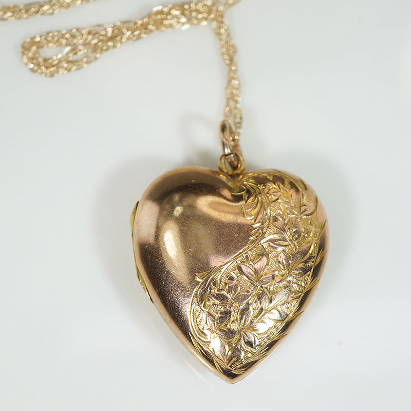 This pretty puffy heart locket has a spray of flowers engraved up one side on the front and the back is free of engraving. The locket closes with a nice snap, and has ample room for photos. The locket is hallmarked on the back for Chester, 9ct, 1910, the chain is 10k.
