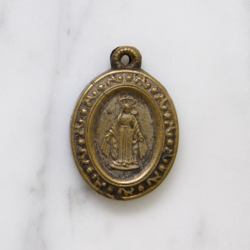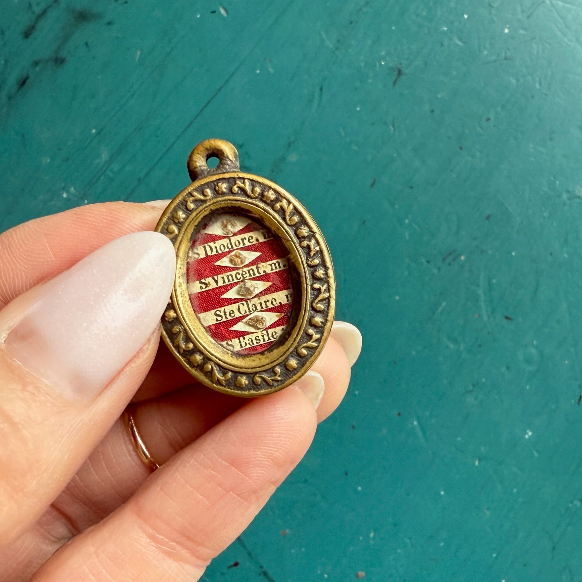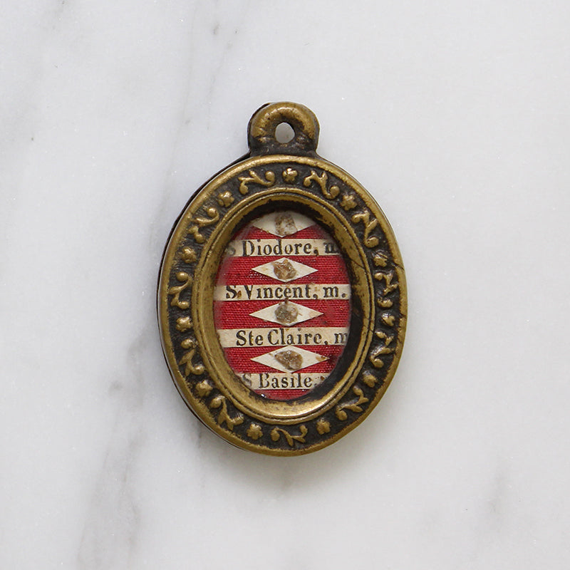 A rare, turn of the 18th Century reliquary holding relics of St. Diosorus, St. Vincent, Ste. Claire, and St. Basil. The relics appear to be tiny bone shards, displayed under glass within the brass pendant. It's obverse side is engraved with an image of the Virgin Mary. Perhaps this piece's original owner completed a pilgrimage, traveling to visit all of these Saints' shrines. Circa 1800.