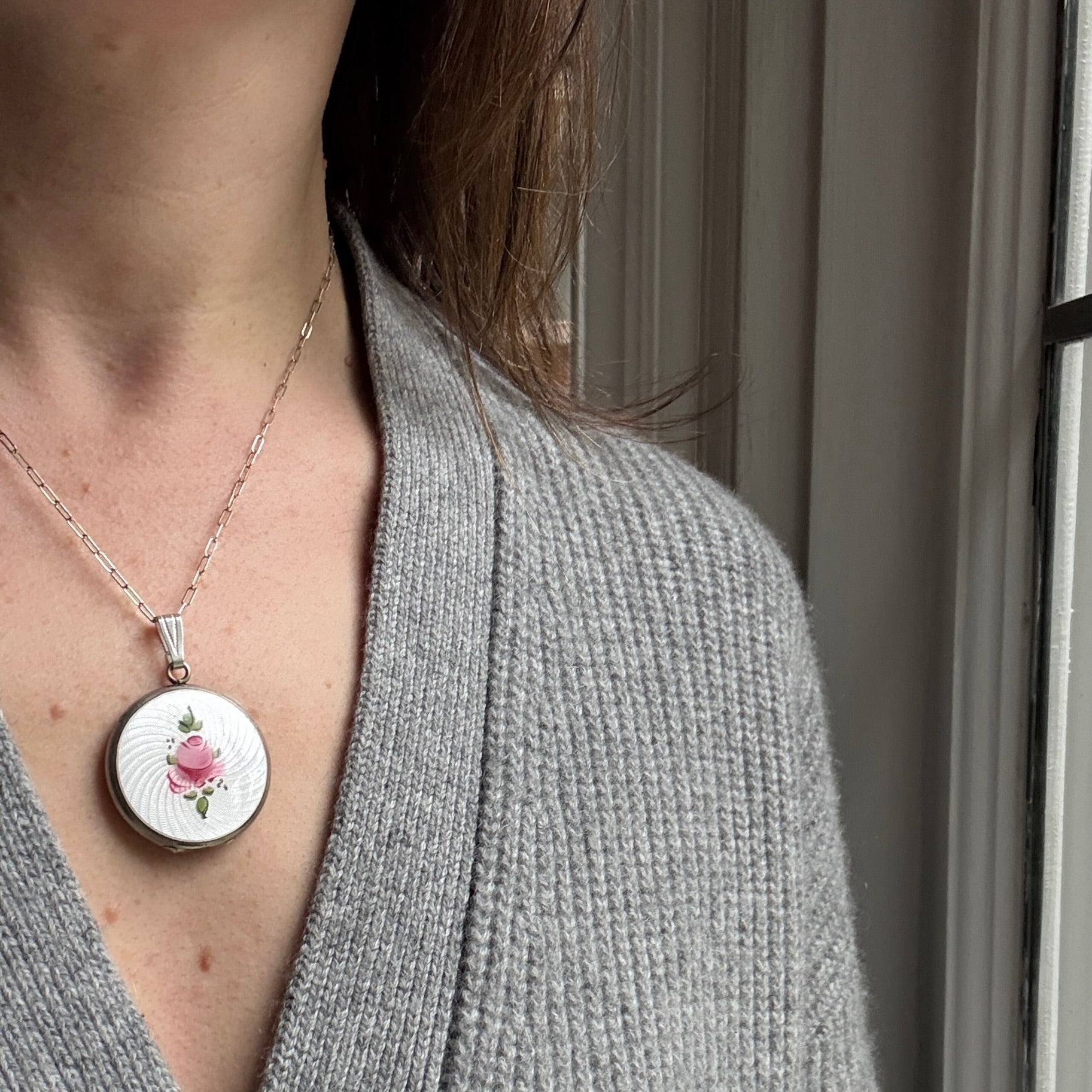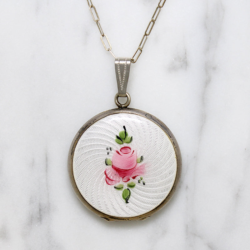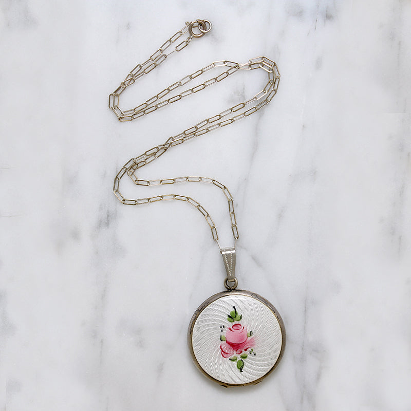 This Mid Century sterling silver locket is replete with 1950s romance. The front of the round locket is adorned with a pink and green rose, blooming on a field of white guilloché enamel. The back of the pendant is plain. The interior is clean with no glass, and it is marked "Elgin American Made in U.S.A." An engraved bale suspends the locket from a vintage sterling silver paperclip chain. Circa 1950.