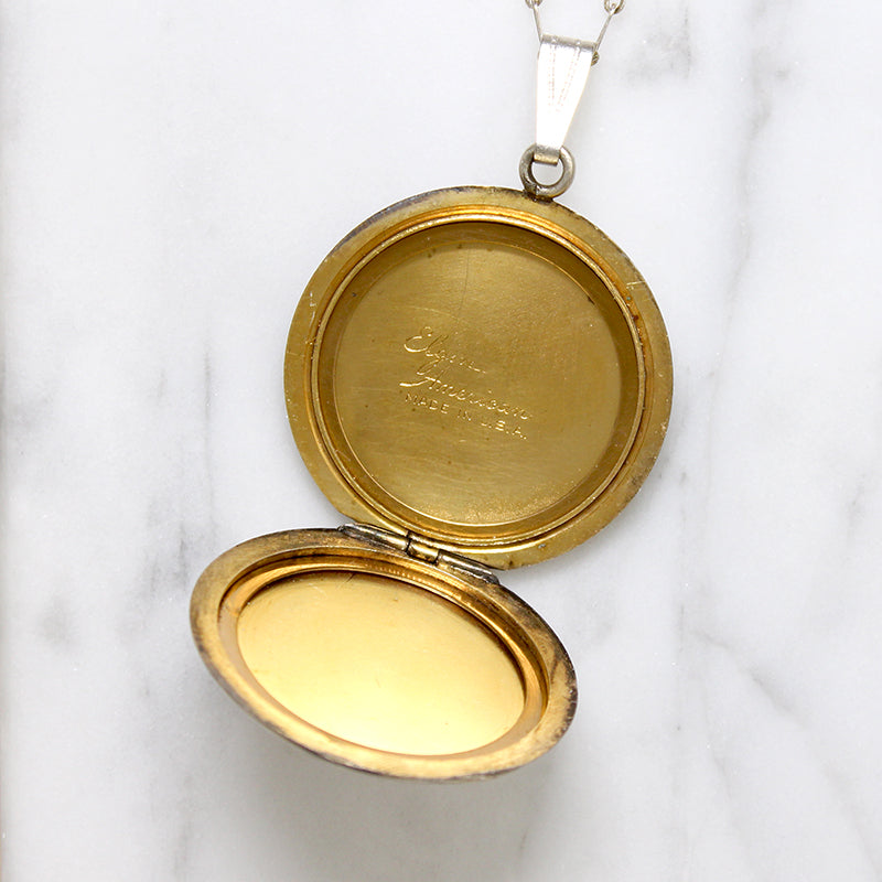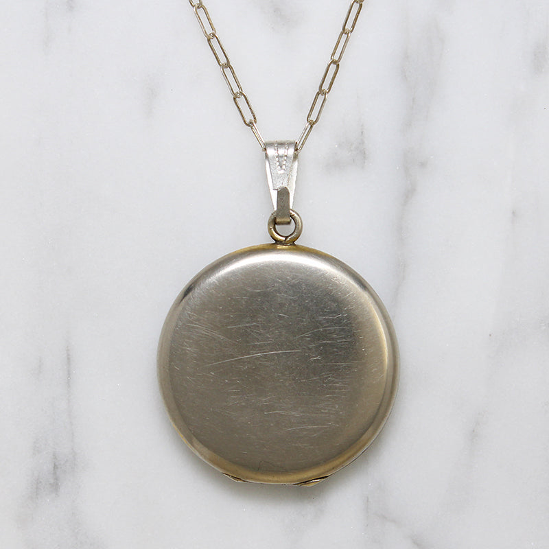 Details.....The chain is 18" long. The locket measures 1.21" in diameter, 1.75" with bale. In Very Good Vintage Condition. You should always expect some wear to antique and vintage jewels; we consider it part of their charm.