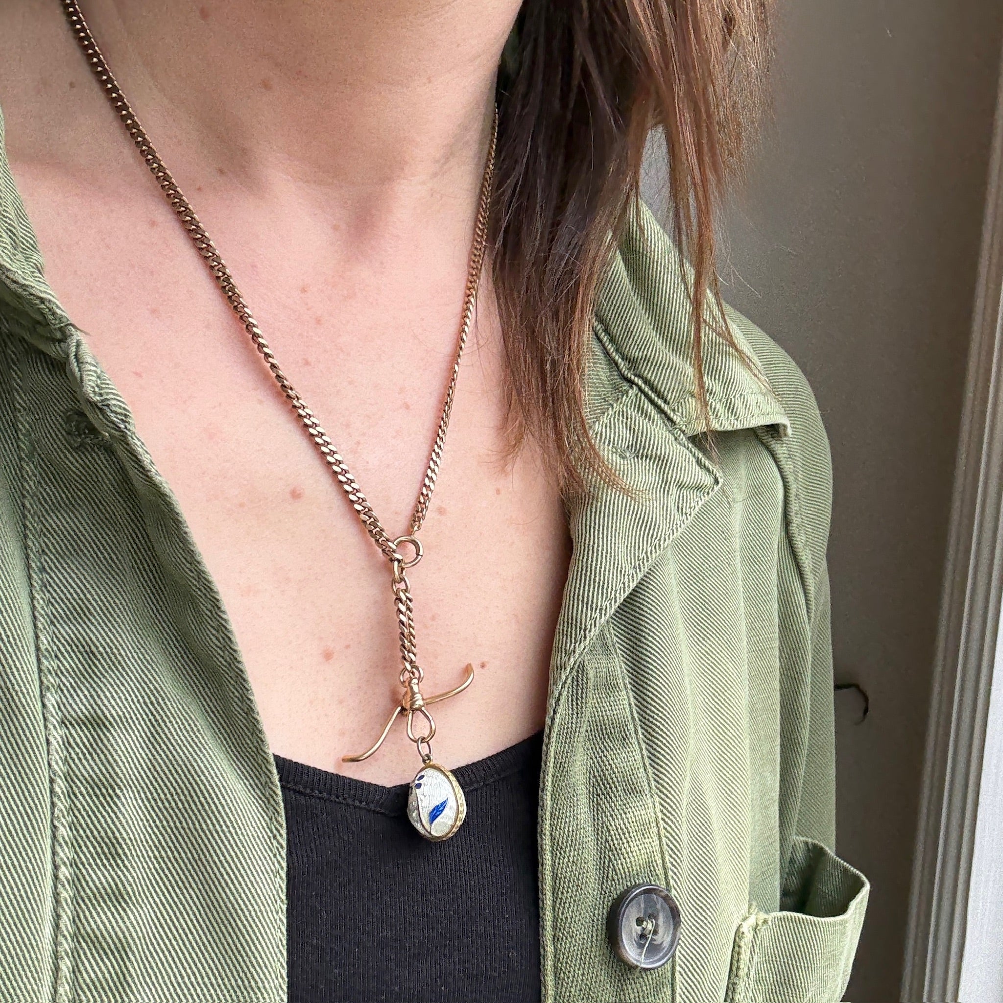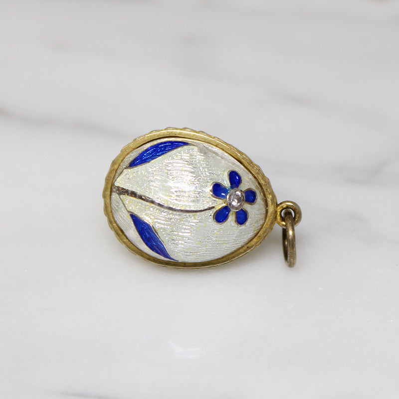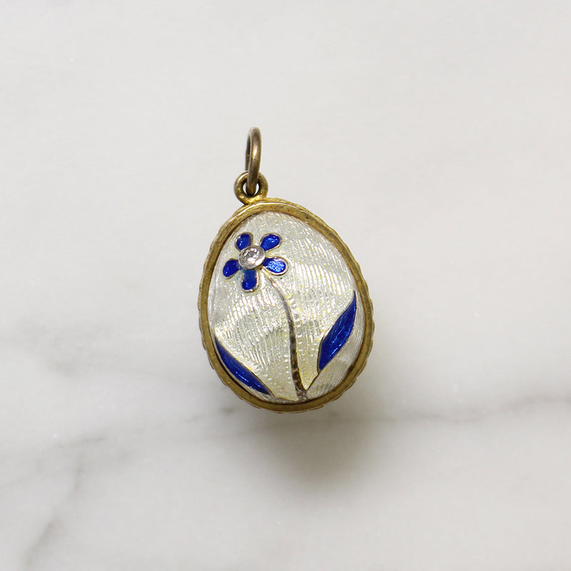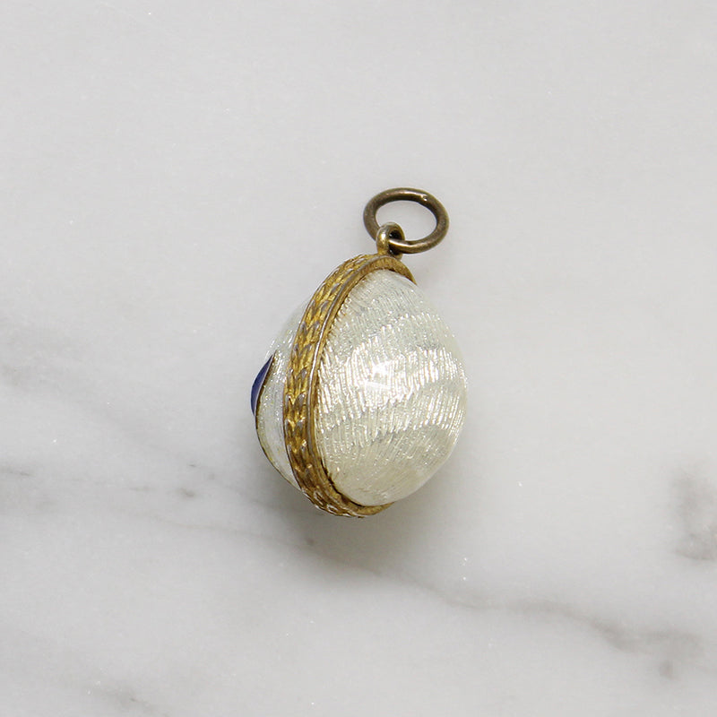 A wee enamelled egg charm, in homage to the great Fabergé. The gilt metal egg bears a single blue daisy on a field of white guilloché enamel. A tiny crystal glitters at the center of the flower. A golden band girds the egg, creating the illusion that the charm opens. A jump ring has been added to the bale for ease of wear. Circa 1920.