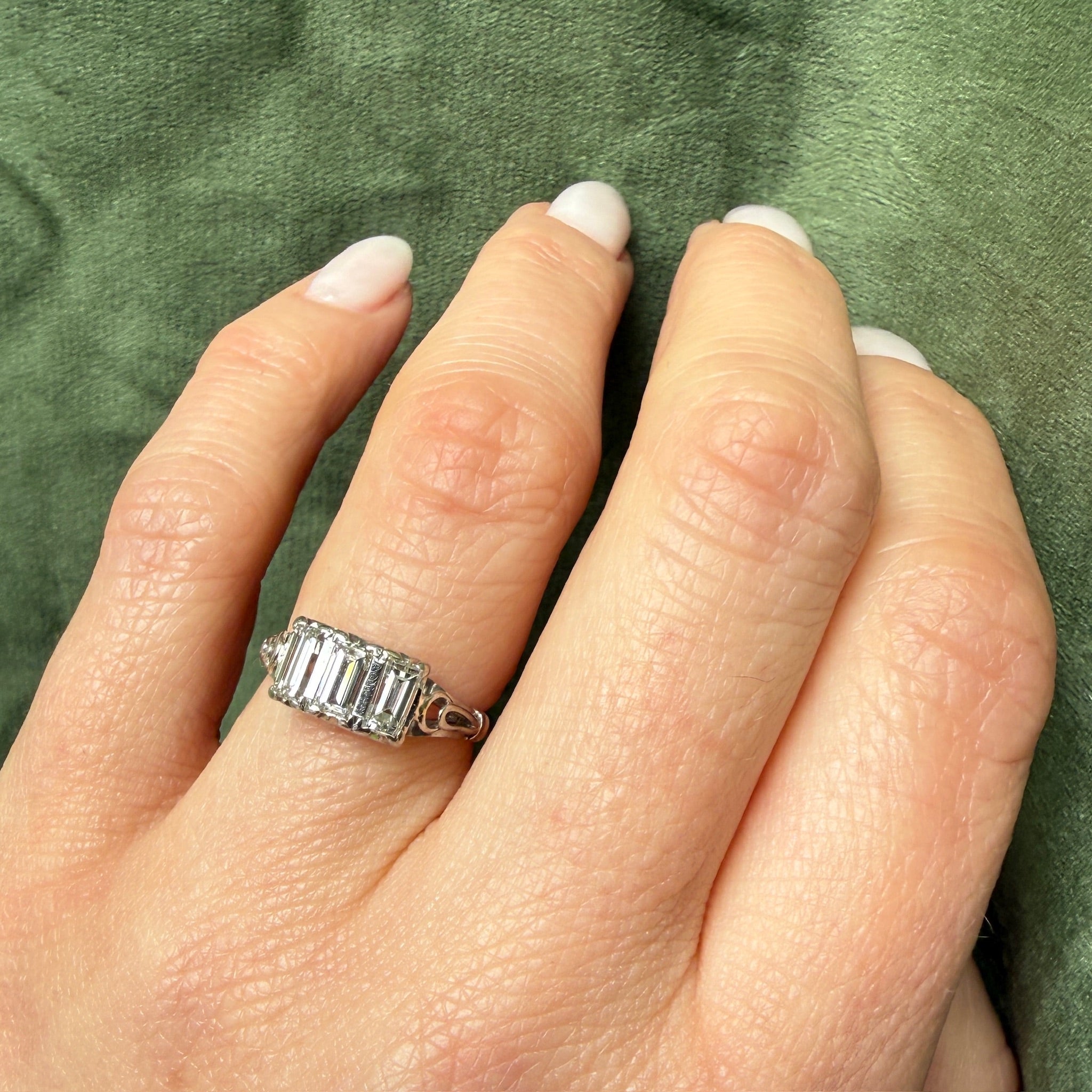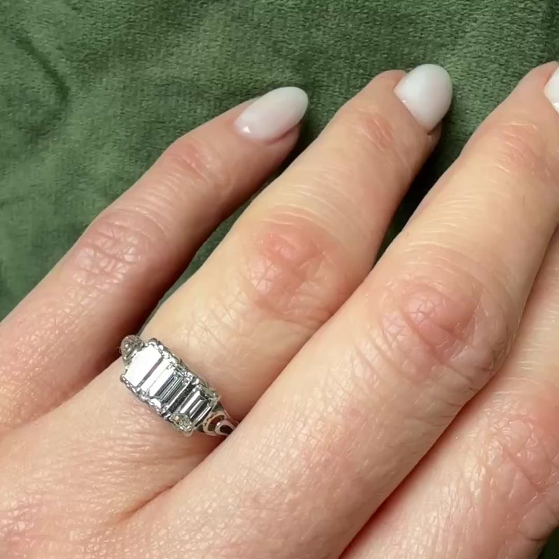 Art Deco Emerald Step Cut Diamond Trilogy Ring