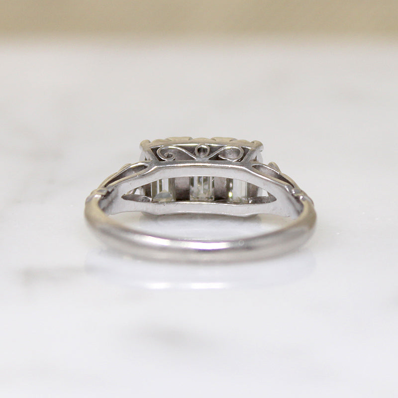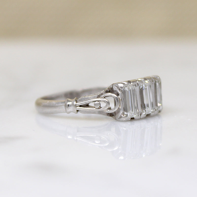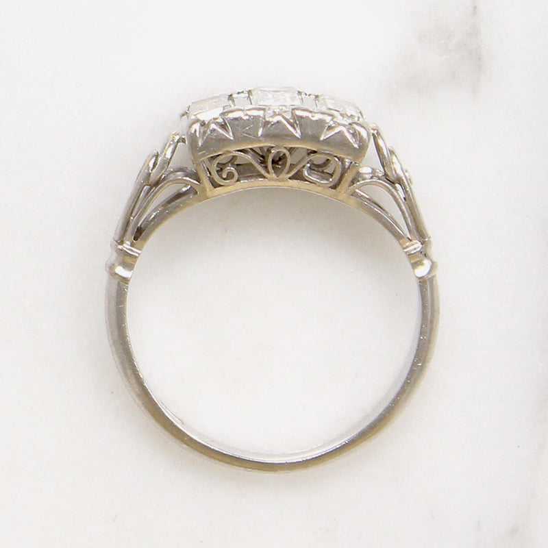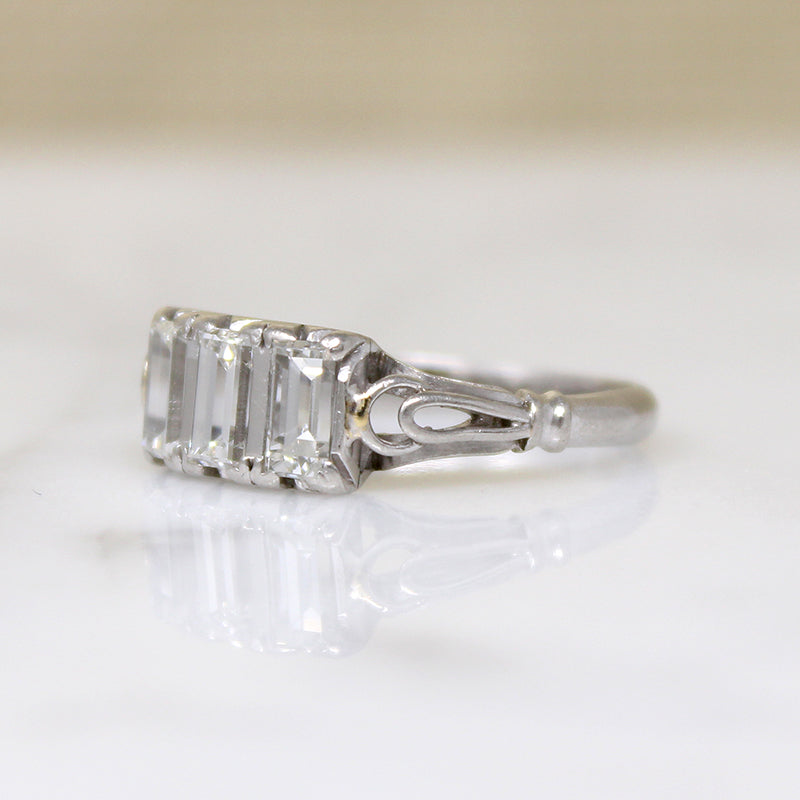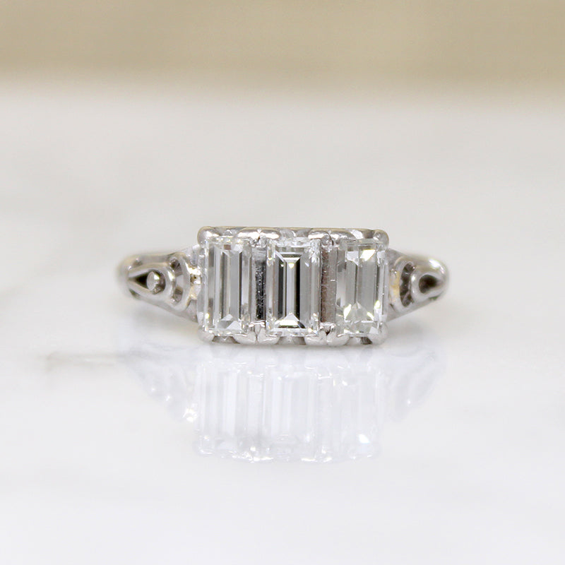 Such an unusual example of the romantic trilogy ring: three precious stones symbolizing a bright past, present, and future. A trio of glittering emerald step cut diamonds are set vertically across the top of this Art Deco platinum and palladium ring. The elegant stones are complimented by their softly scrolling, hand fabricated setting; a lacy gallery and delicate openwork cathedral shoulders are replete with vintage charm. Circa 1930.