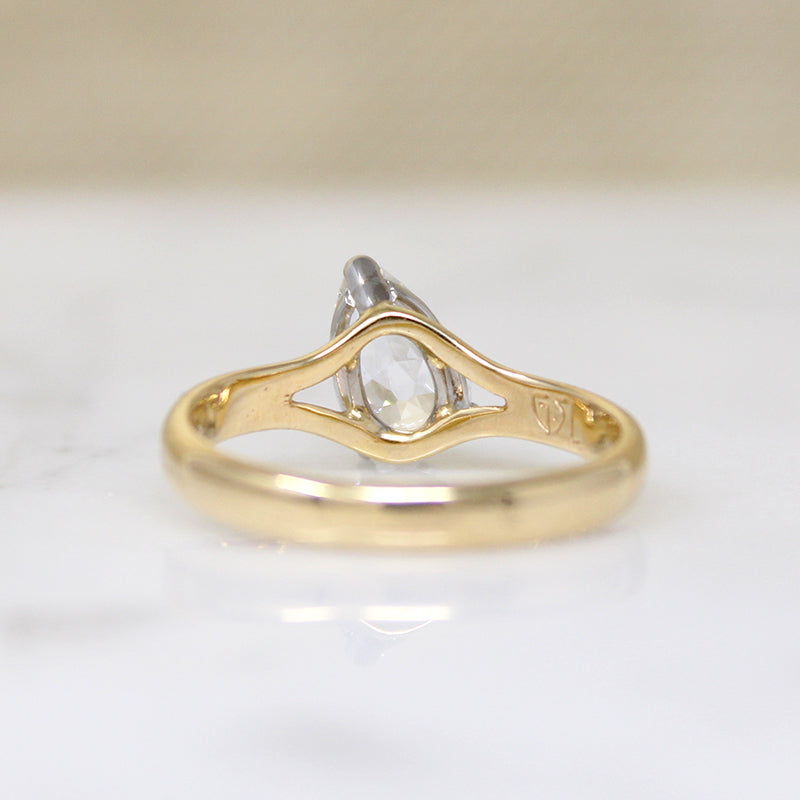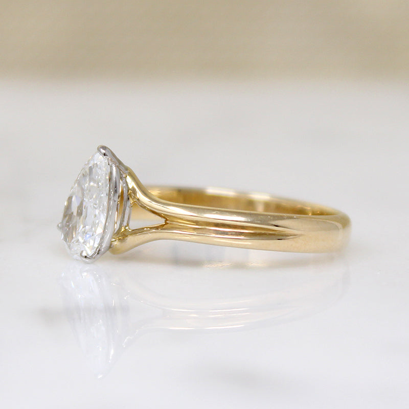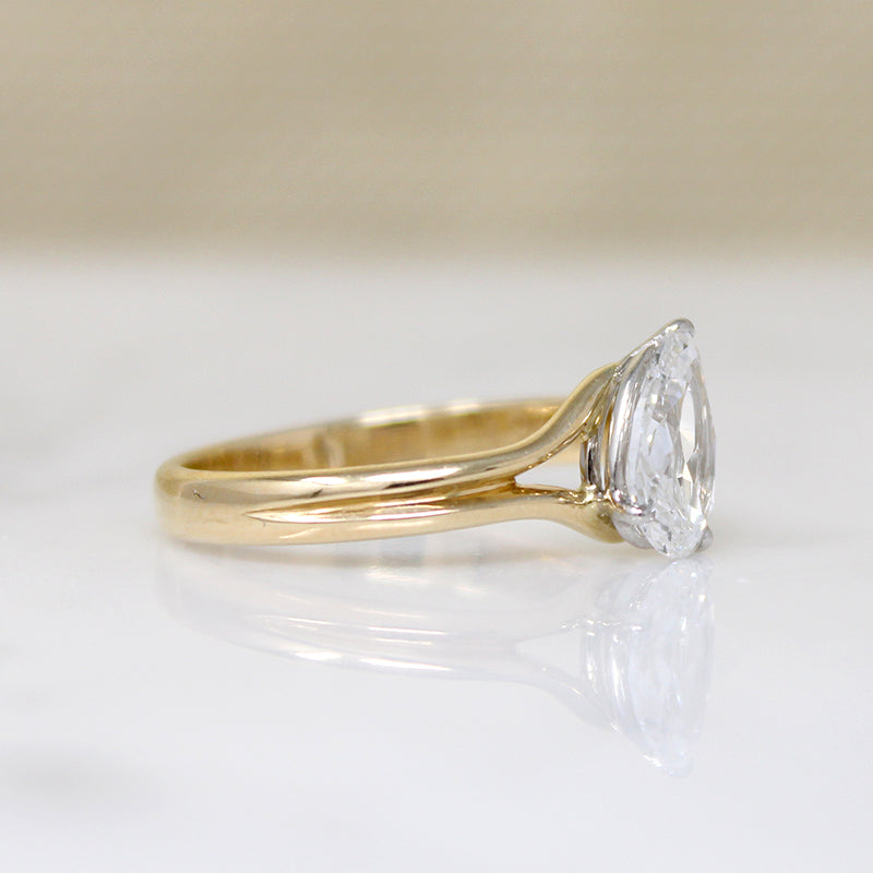 An absolutely fabulous .82ct pear cut diamond is displayed to perfection in this new solitaire ring from our in-house studio. The vintage stone has a bright white E color and a scintillating VS2 clarity; it is prong-set in a platinum head that is placed at an off-set angle atop the 18k gold ring. Split shoulders and a tapering, grooved band add tasteful details to this clean-lined and elegant engagement ring.