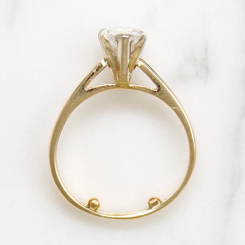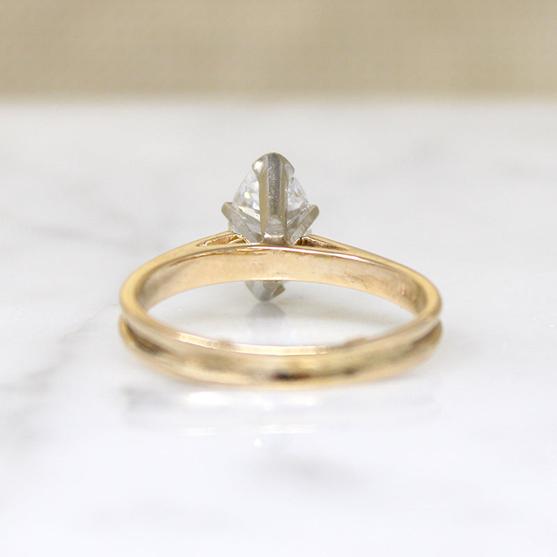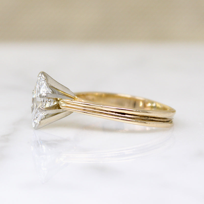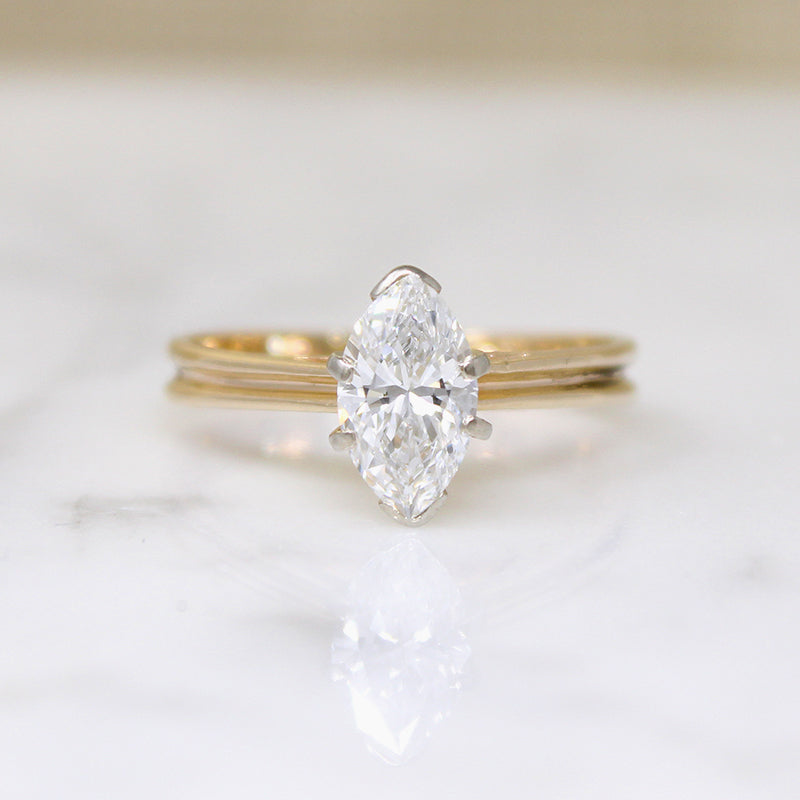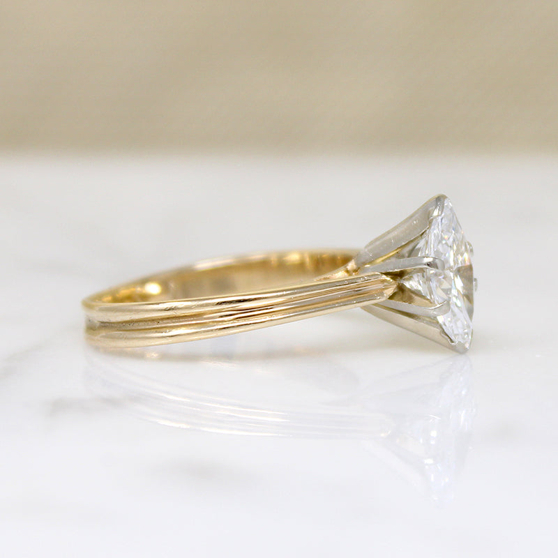 A brilliant 1.22ct marquise cut diamond is set in this classic 14k gold solitaire ring. The dazzling diamond is displayed proudly in a white gold head, with prongs at the stone's sides and v-caps protecting the points. Pinched cathedral shoulders and a grooved band complete the sophisticated look, providing a touch of Modernist styling. We don't see many marquise diamonds, and this one is a beaut. Circa 1970.