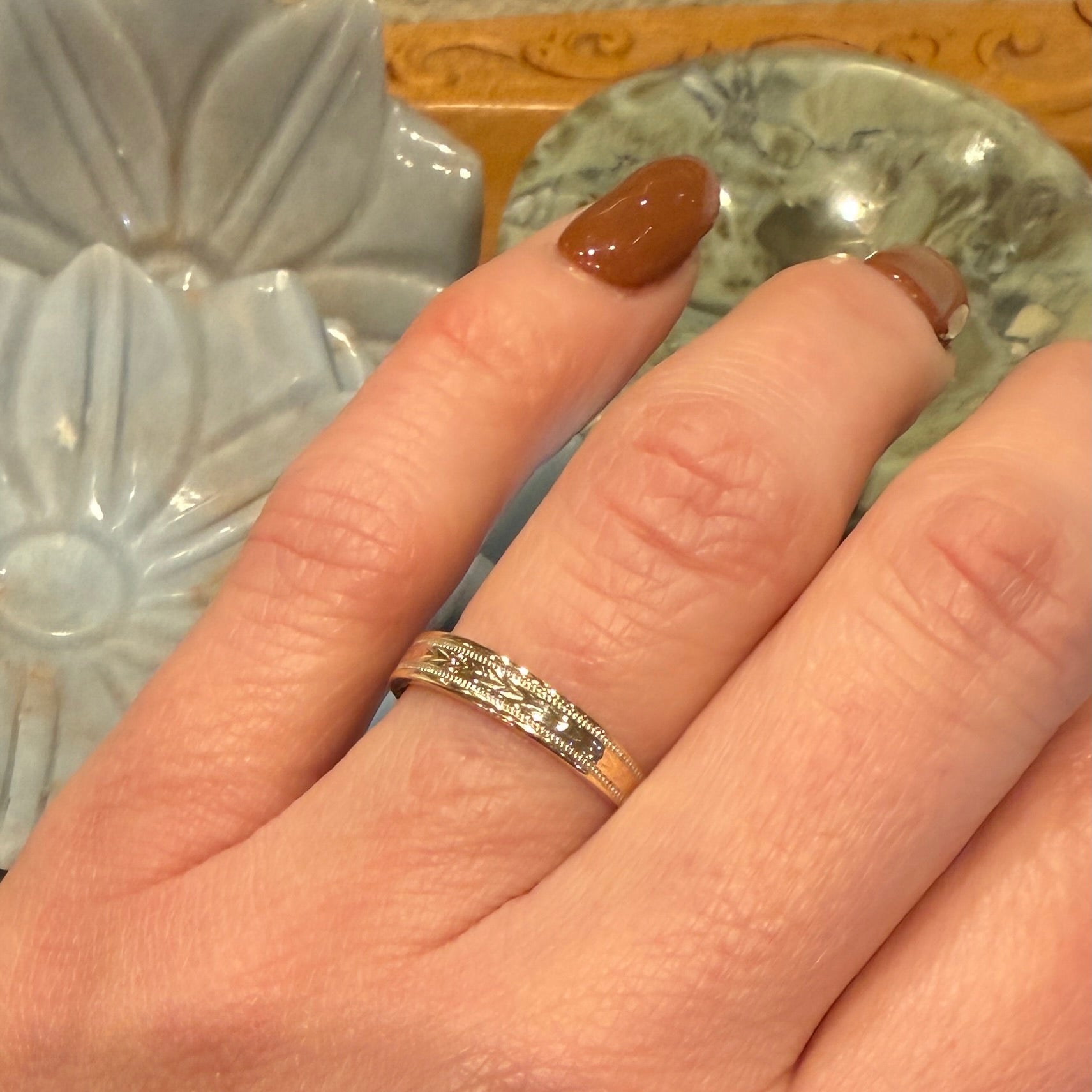 Chevron Engraved 14k Gold Tapered Band