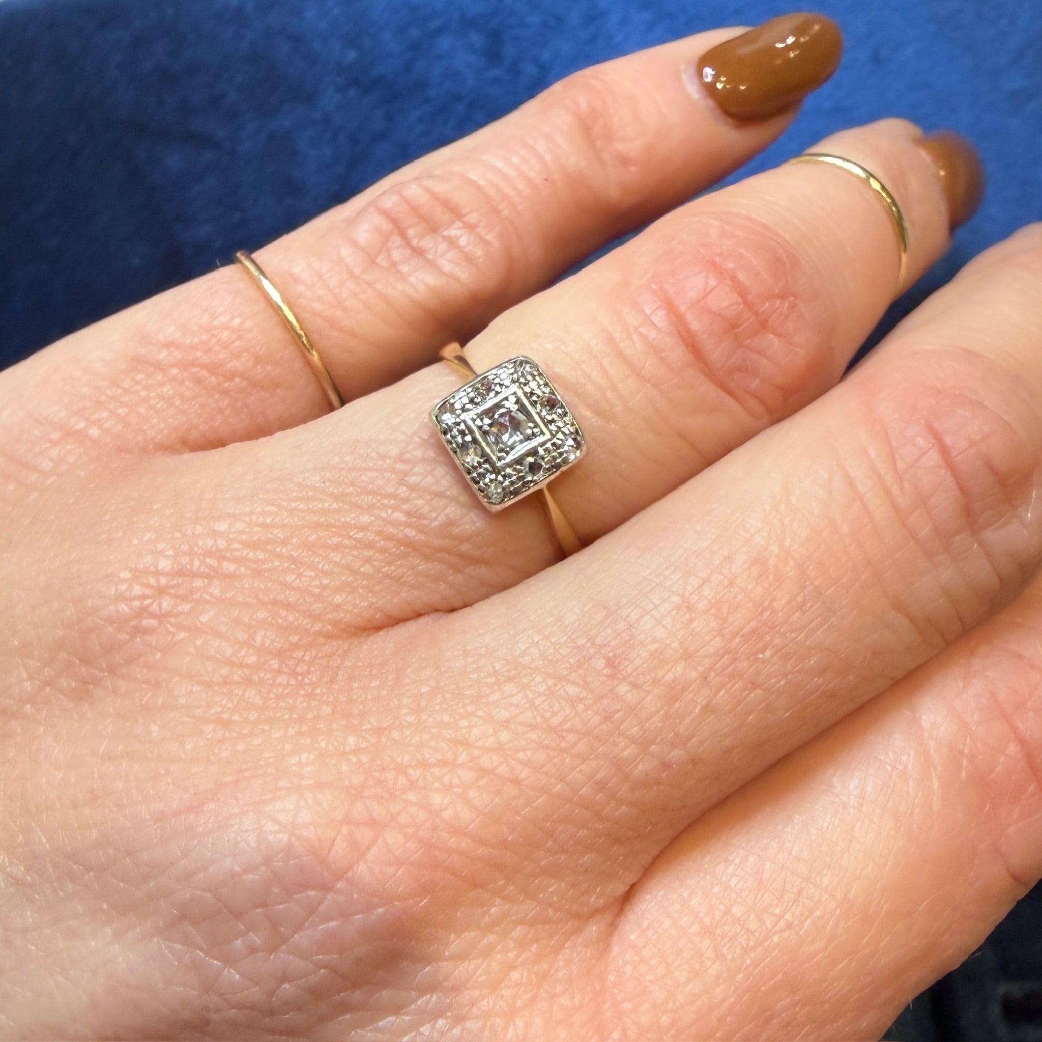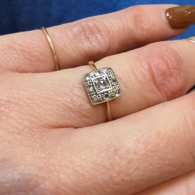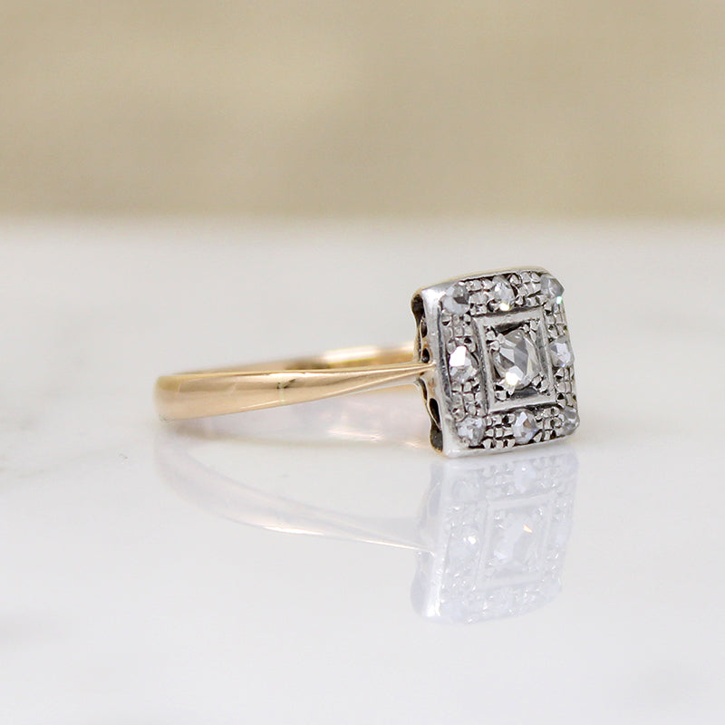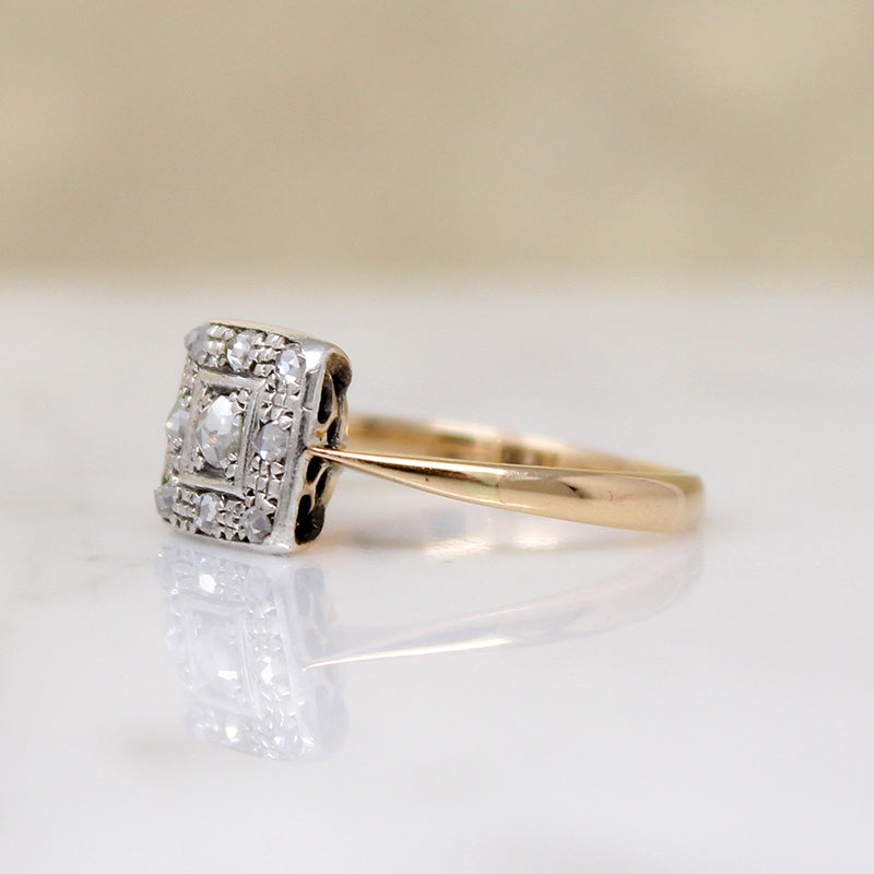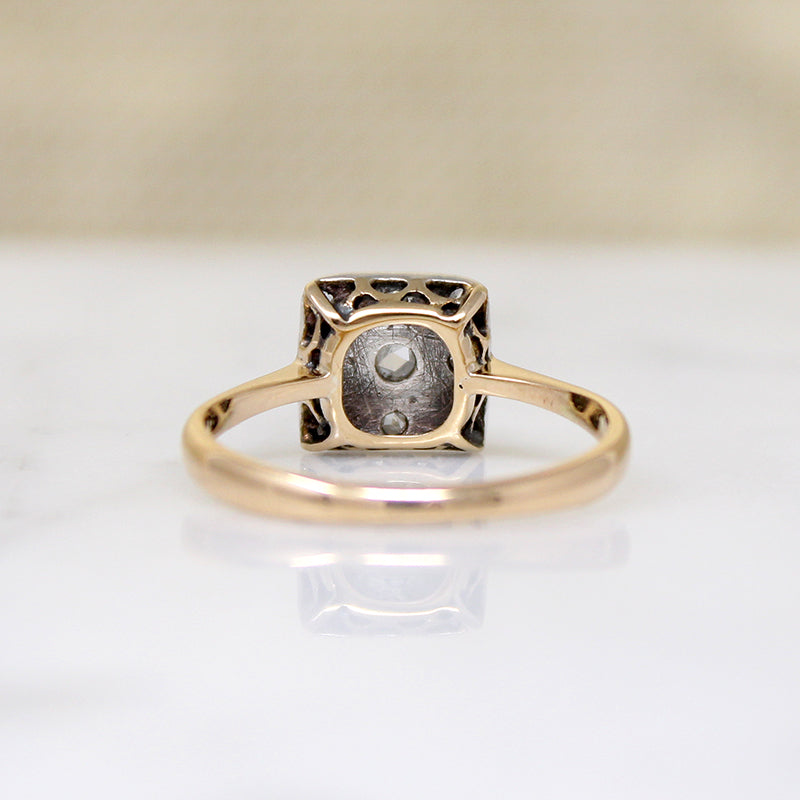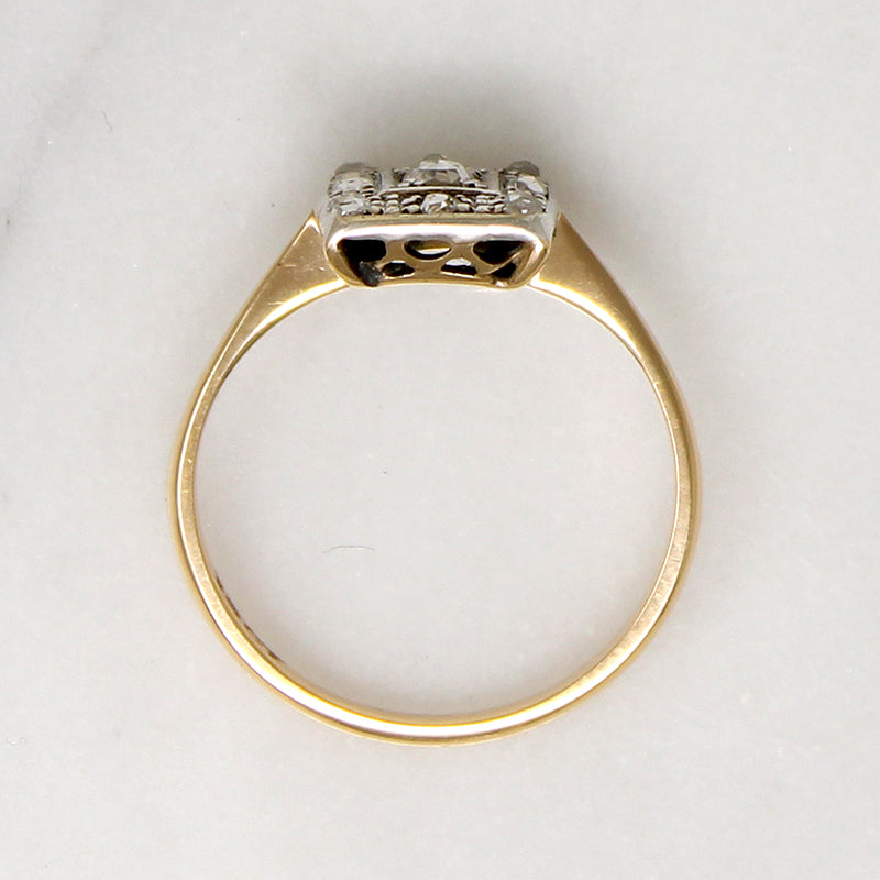 This darling English ring features a platinum square set with twinkling rose cut diamonds. A larger diamond is framed in a border of eight smaller stones and glittering engraving. The gem-set platinum is layered over an 18ct gold ring, with a shallow, pierced gallery and dainty pinched shoulders that flare gently into a slender half round band. Thoughtful details make this ring lovely from every angle. Circa 1890.