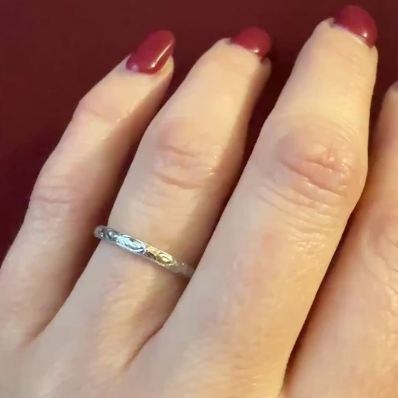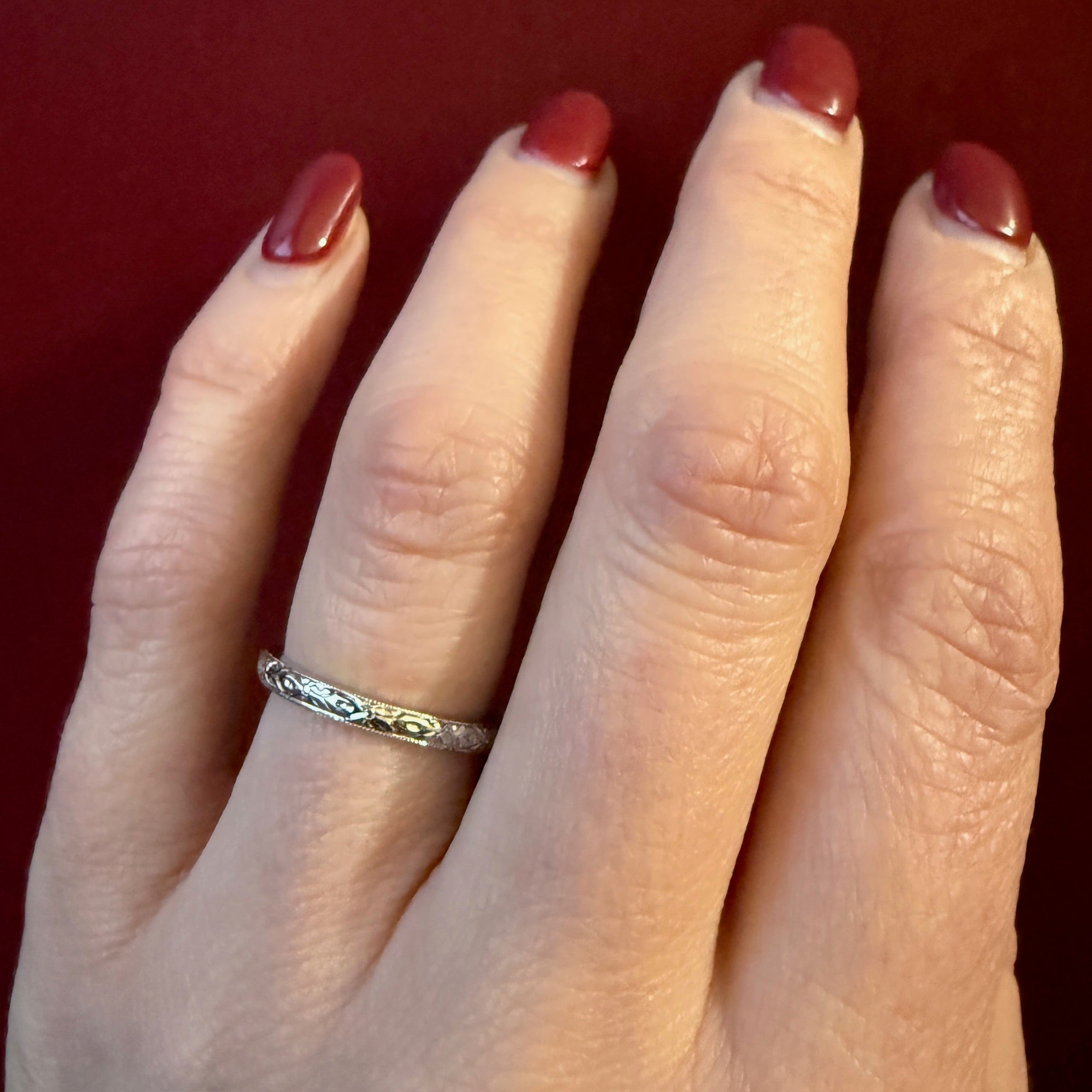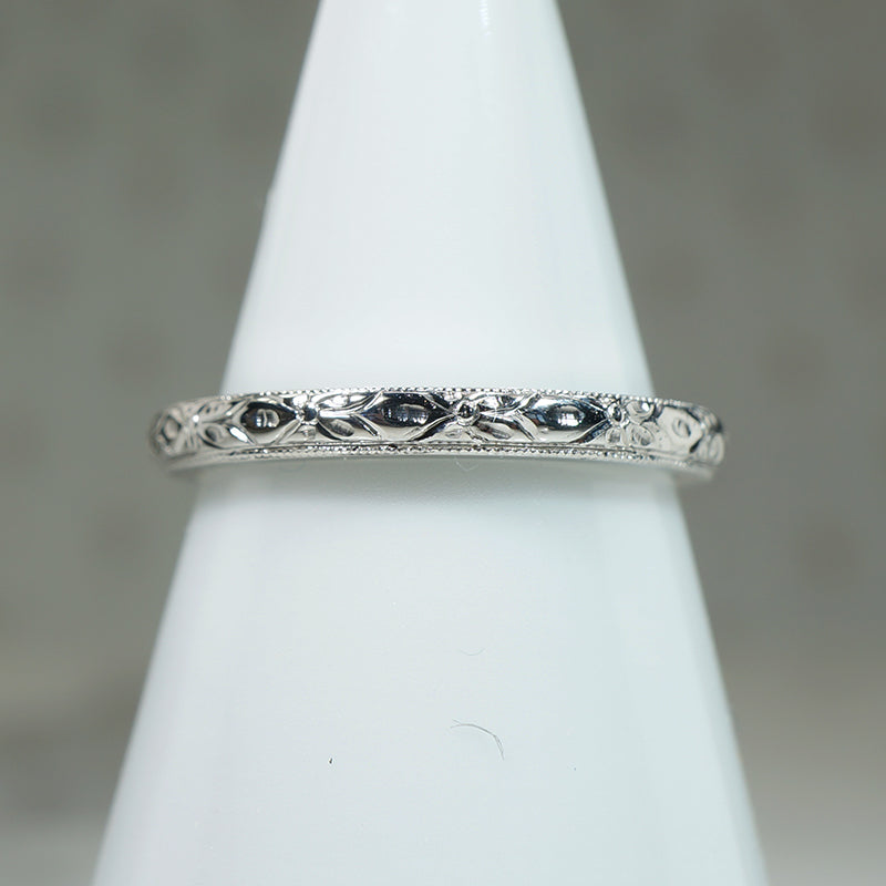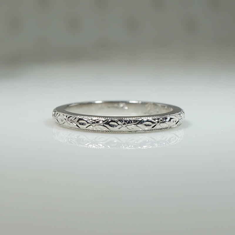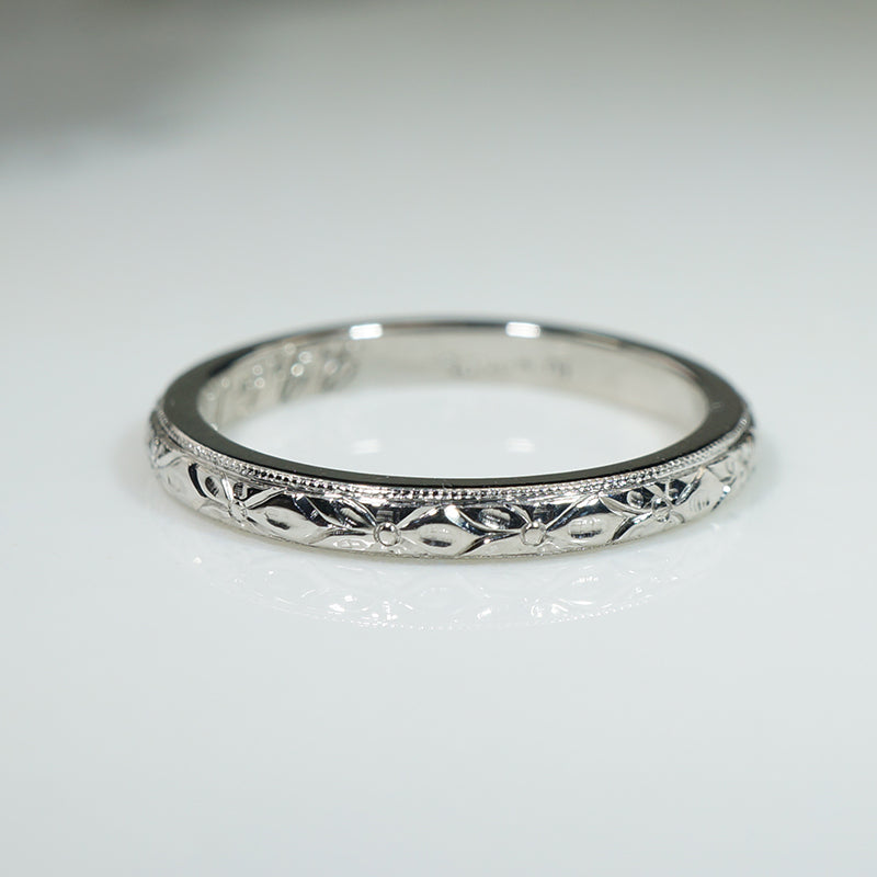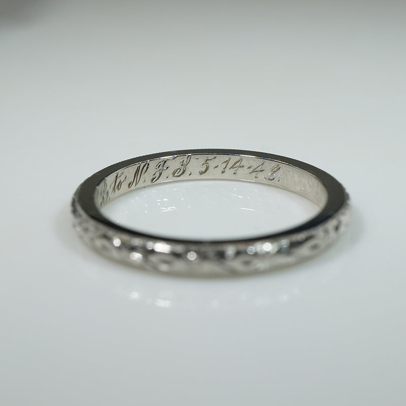 This enchanting platinum band is engraved with a wreath of dogwood blossoms; it's in lovely, crisp condition. The ring's soft, half round exterior has flat sides, edged in milgrain beading. Its interior is engraved with the personal inscription, "RR to NFJ 5-14-48." A romantic piece that will pair beautifully with a wide variety of vintage engagement rings.