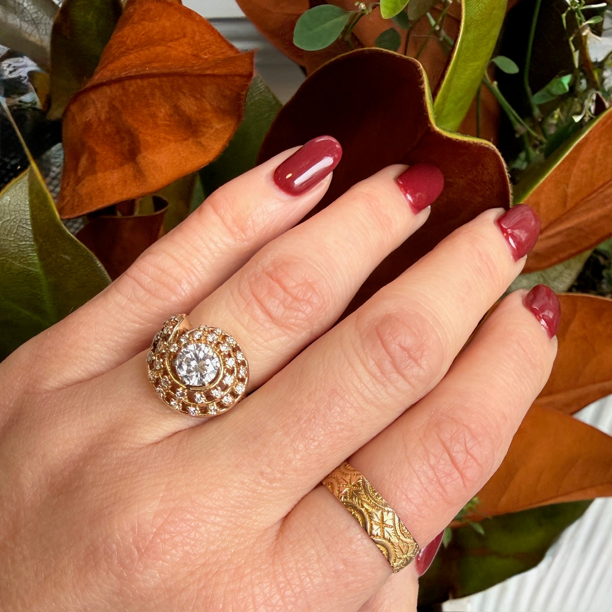 Little diamonds swirl around the center diamond in a double row resembling the inside of a seashell. The twisty design of the gold holding the rows of diamonds adds to the implied movement of the brilliant design. I love jewels from the 1960s. The ring is marked inside the band 14kp, the p stands for plumb, seen on quality jewels.
