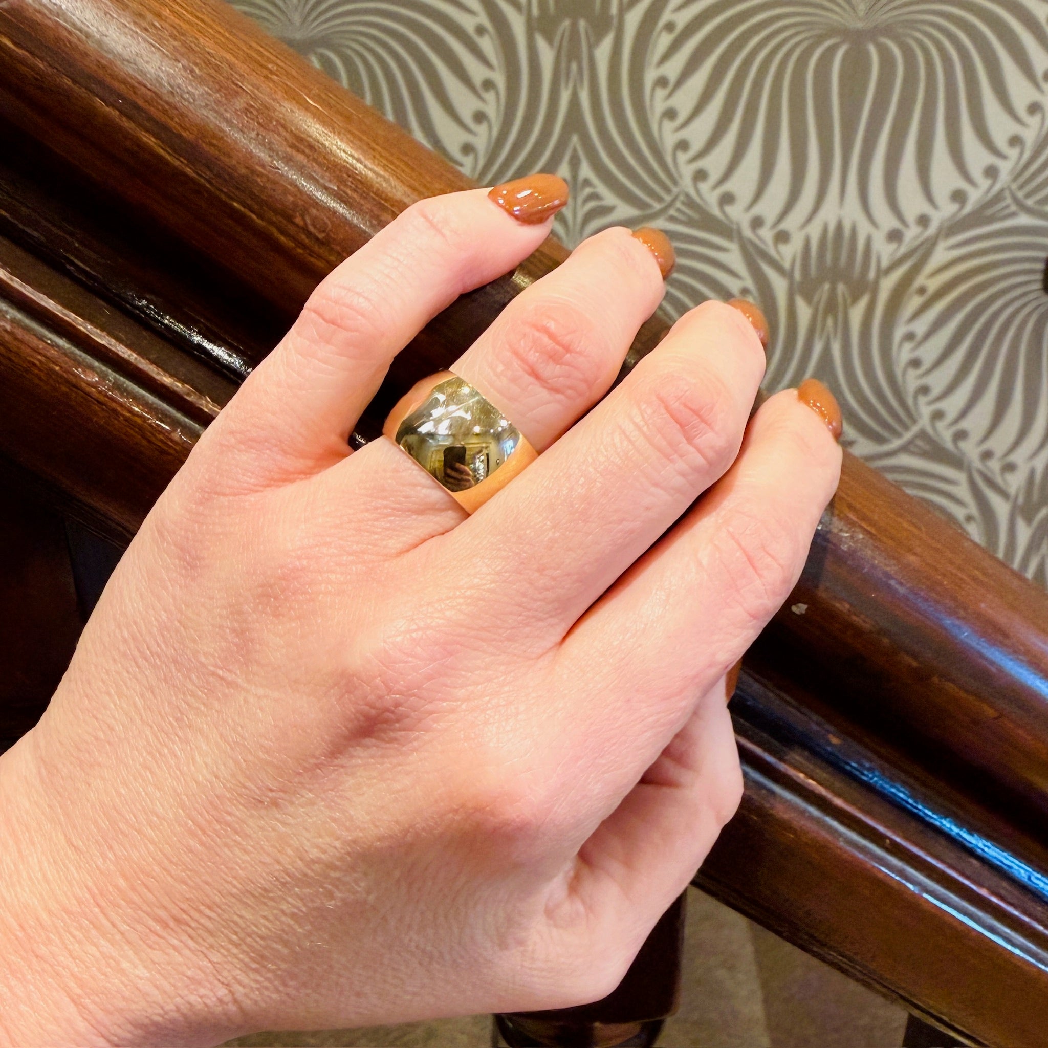 A luxurious Mid Century 14k gold cigar band. This extra wide band has a soft half round exterior curve and a flat interior. A glossy gold band of this proportion makes a dramatic, yet tasteful, statement. Circa 1940.