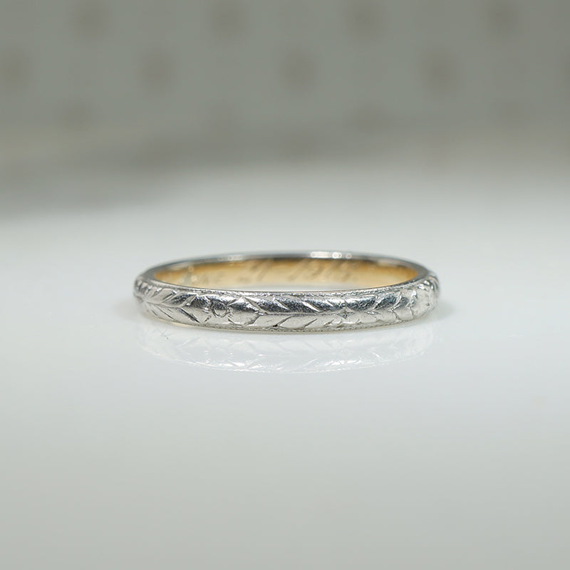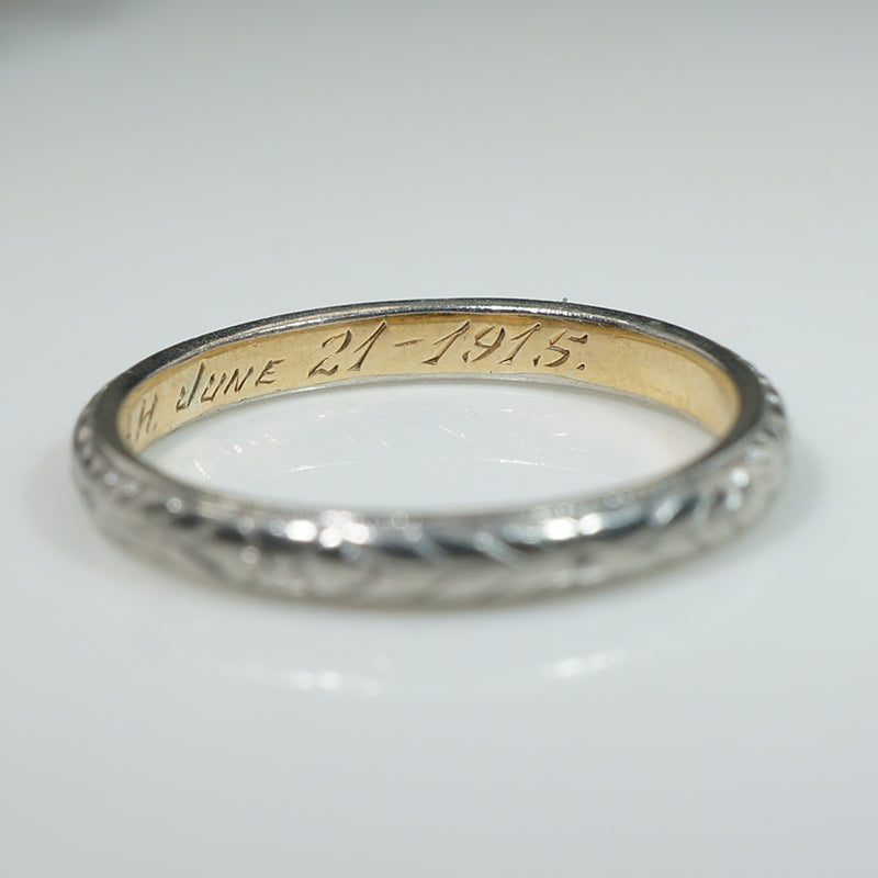 A luxurious antique wedding band made of platinum layered over 14k yellow gold. The platinum is engraved with a wreath of delicate leaves and flowers. It bears the maker's mark "P&S," and a sweet personal inscription that reads, "H.W.C. to M.A. H. June 21-1915." Fine quality and elegant details.